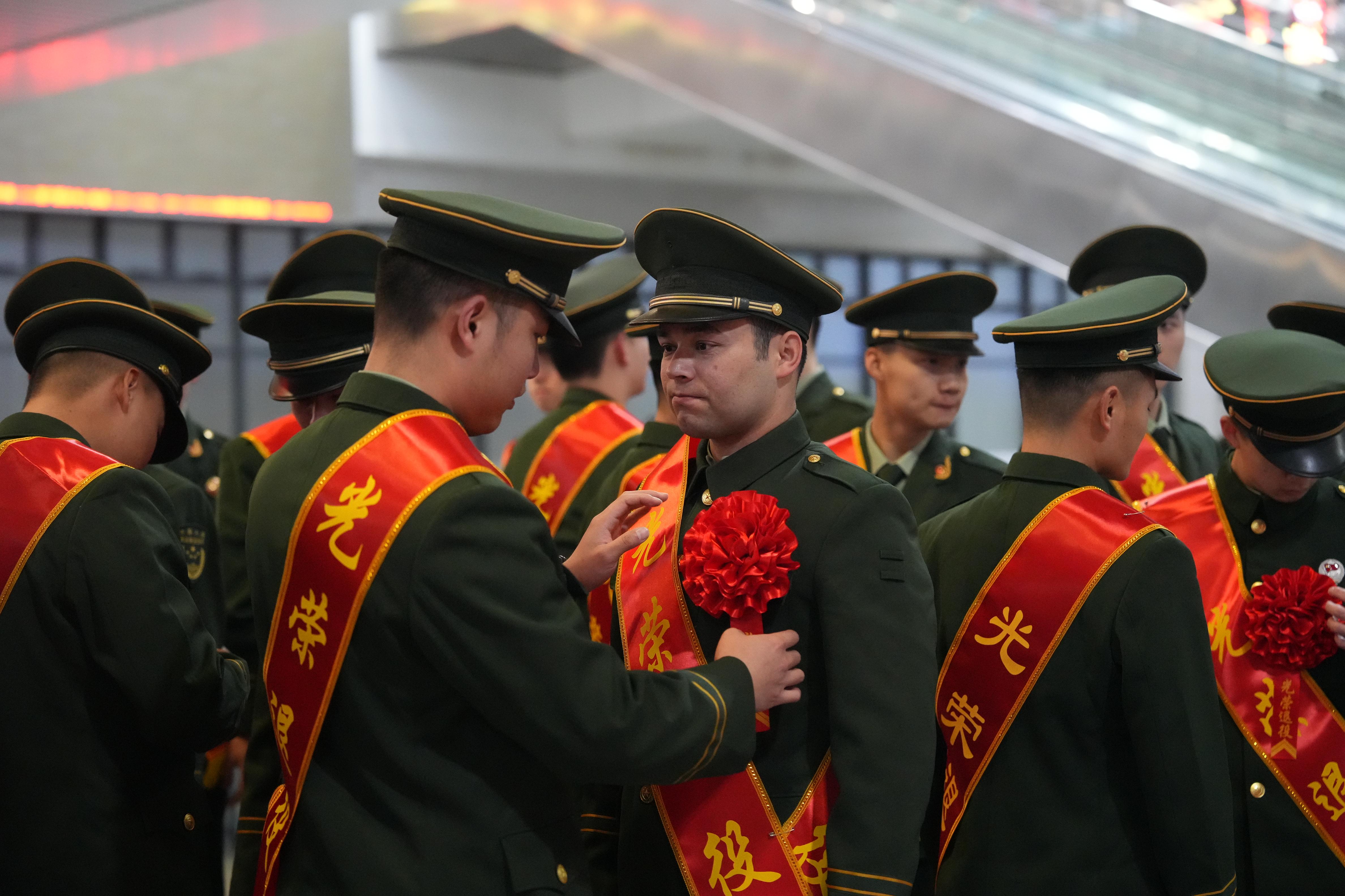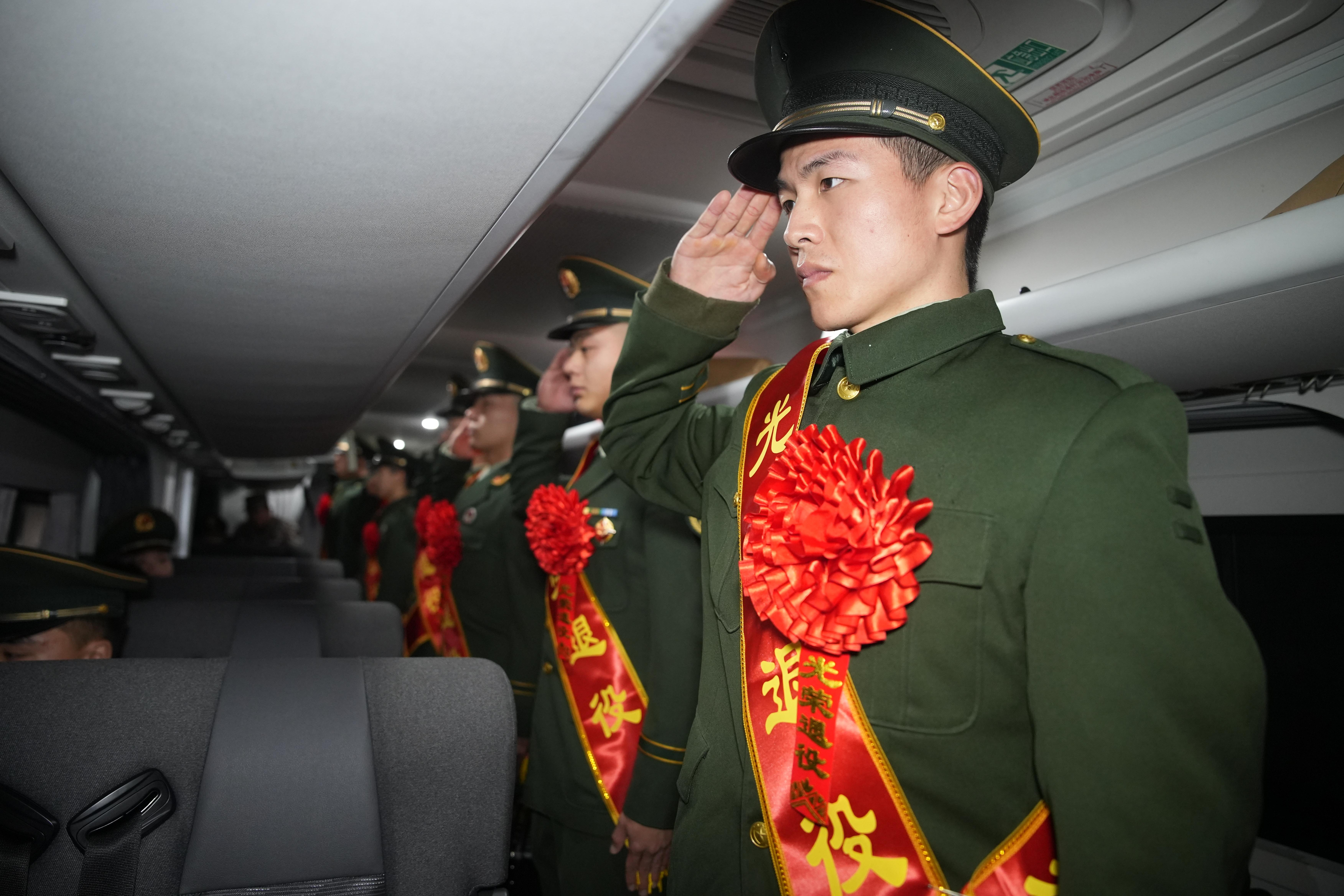 “我宣誓:服从中国共产党的领导,忠于祖国……”在福州火车站候车大厅,退役士兵们身披绶带整齐列队,高举右拳庄严宣誓,“若有战,召必回”的铿锵誓词为军旅生涯画上圆满的句号。