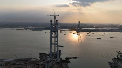 “今年1月主塔高度突破了300米,现在正是施工的冲刺阶段。”田志英望着桥塔,语气中流露出自豪。他告诉我,这座大桥建成后,将创造多项世界第一。