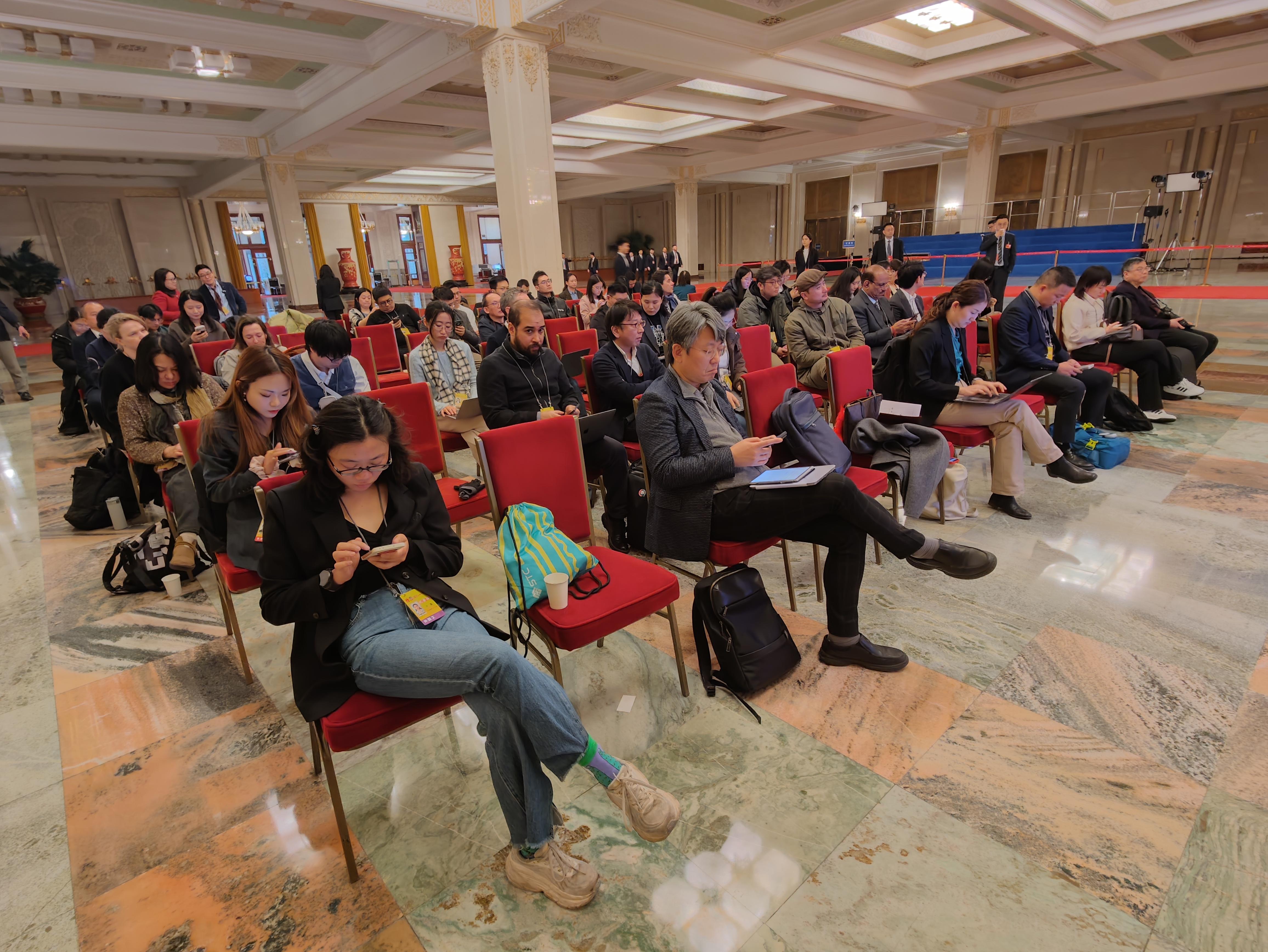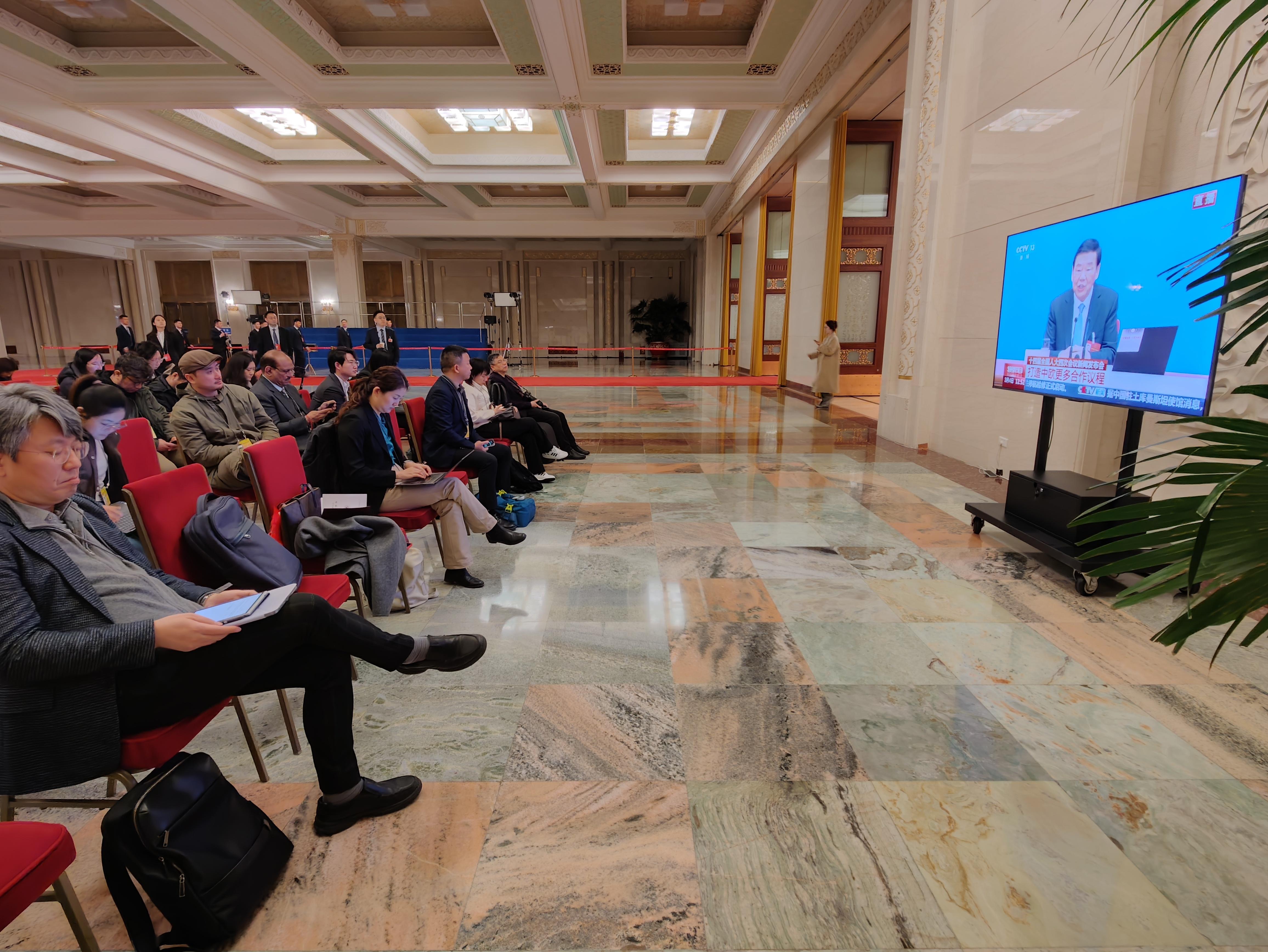 场内,中外记者的长枪短炮层层叠叠,主厅早已座无虚席,连过道都站得满满当当。我们立在门口,清晰看见前排记者发间挂着未融的浮雪。工作人员笑着提醒:“早点去听会区吧,声音画面都清楚,一样能写。去晚了,那边也没位置了。”