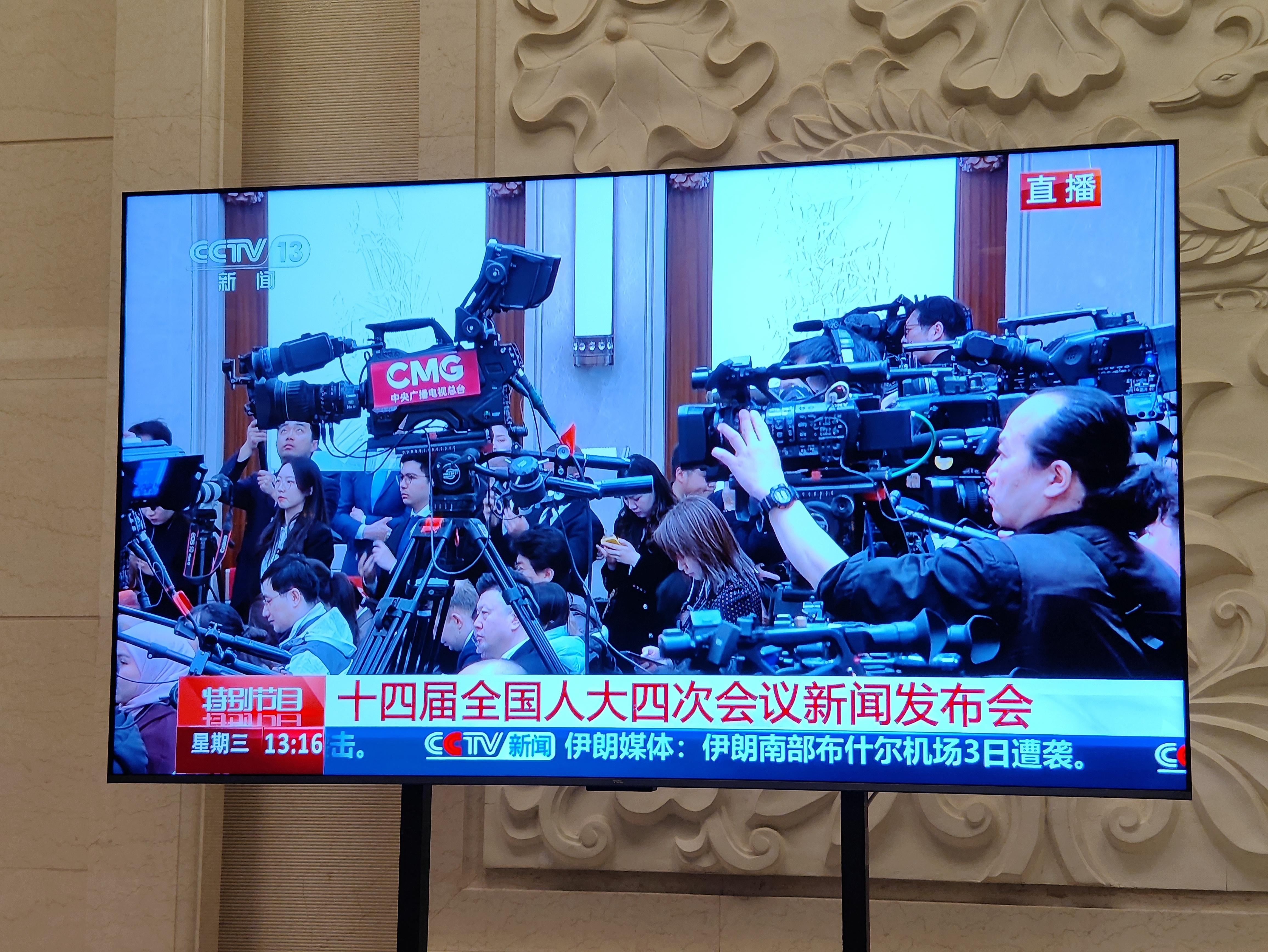 3月4日11时许,人民大会堂新闻发布厅外,距离十四届全国人大四次会议新闻发布会开幕还有半个多小时,我们已无法进入主厅——在潮水般涌来的记者群中,我们被引导至隔壁的听会区域。