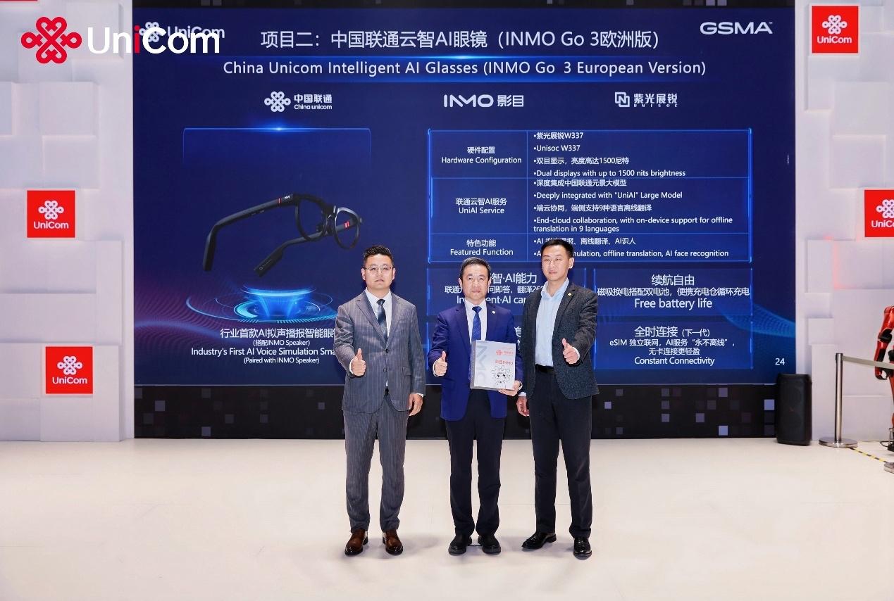 在世界移动通信大会MWC落户巴塞罗那20周年之际,中国联通联合影目科技、紫光展锐等生态合作伙伴,于西班牙巴塞罗那当地时间3月3日下午共同发布了中国联通云智AI眼镜—INMO Go 3(欧洲定制版)。