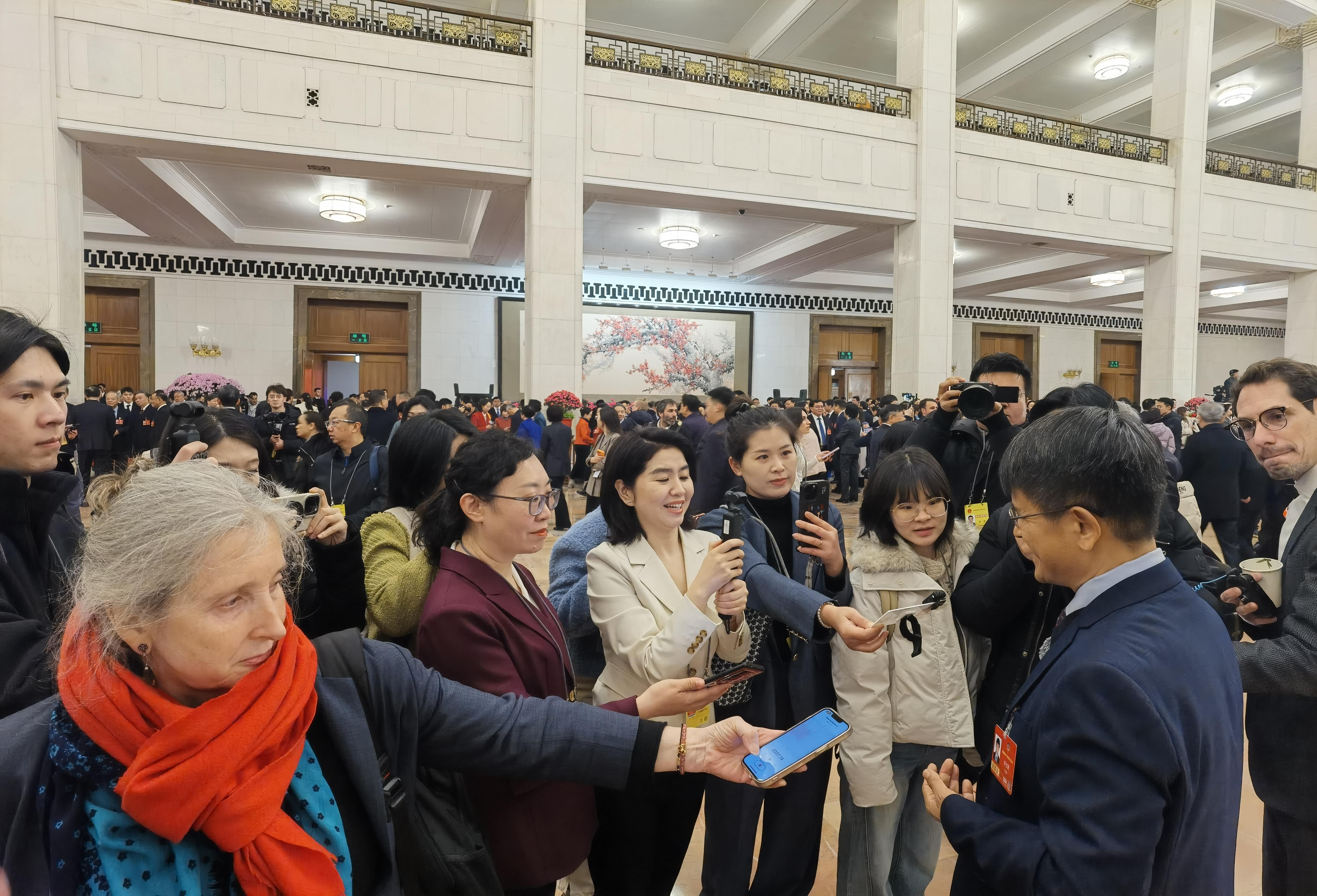 会议间隙,他们只要脚步刚迈出会场,身影刚出现在通道,立刻会被记者团团围住。话筒被递到面前,录音笔被举到胸前,问题一个接着一个。有人侧身欲走,身后是追着提问的人群,快门声、提问声,此起彼伏。