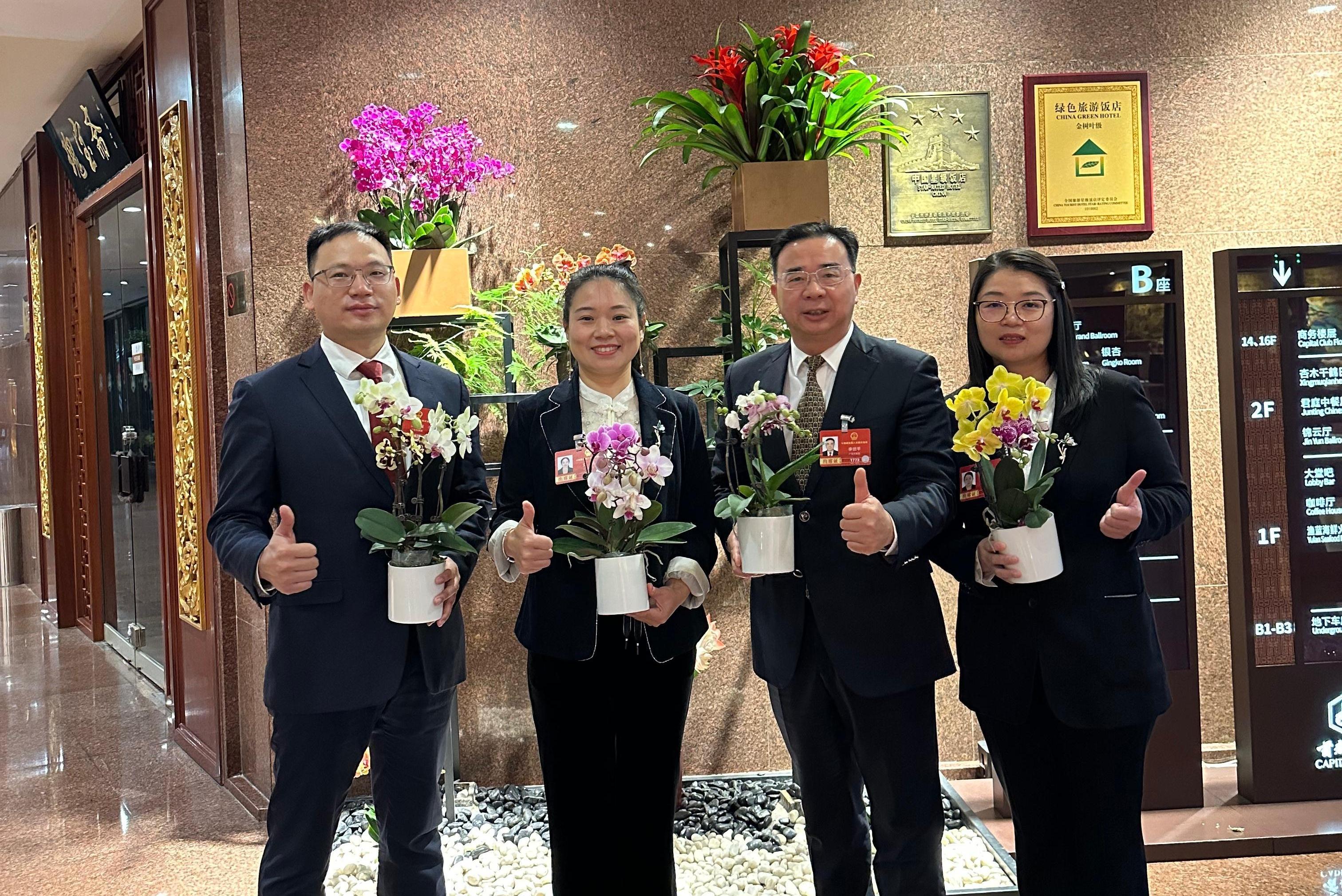 “这是代表带来的翁源兰花。”在工作人员指引下,几经打听,记者找到了这些兰花的主人——全国人大代表、广东亚北农副产品有限公司董事长黄秀芬。