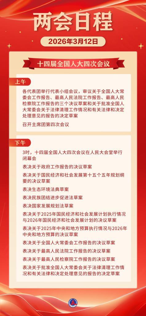 12日下午3时,十四届全国人大四次会议在人民大会堂举行闭幕会,表决关于政府工作报告的决议草案,表决关于国民经济和社会发展第十五个五年规划纲要的决议草案,表决生态环境法典草案,表决民族团结进步促进法草案,表决国家发展规划法草案,表决关于2025年国民经济和社会发展计划执行情况与2026年国民经济和社会发展计划的决议草案,表决关于2025年中央和地方预算执行情况与2026年中央和地方预算的决议草案,表决关于全国人大常委会工作报告的决议草案,表决关于最高人民法院工作报告的决议草案,表决关于最高人民检察院工作报告的决议草案,表决关于批准全国人大常委会关于法律清理工作情况和有关法律和决定处理意见的报告的决定草案。