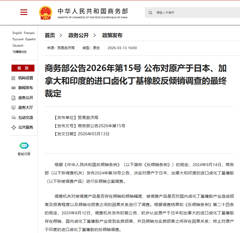 根据《反倾销条例》第三十八条的规定,商务部向国务院关税税则委员会提出征收反倾销税的建议,国务院关税税则委员会根据商务部的建议作出决定,自2026年3月14日起,对原产于日本和加拿大的进口卤化丁基橡胶征收反倾销税。