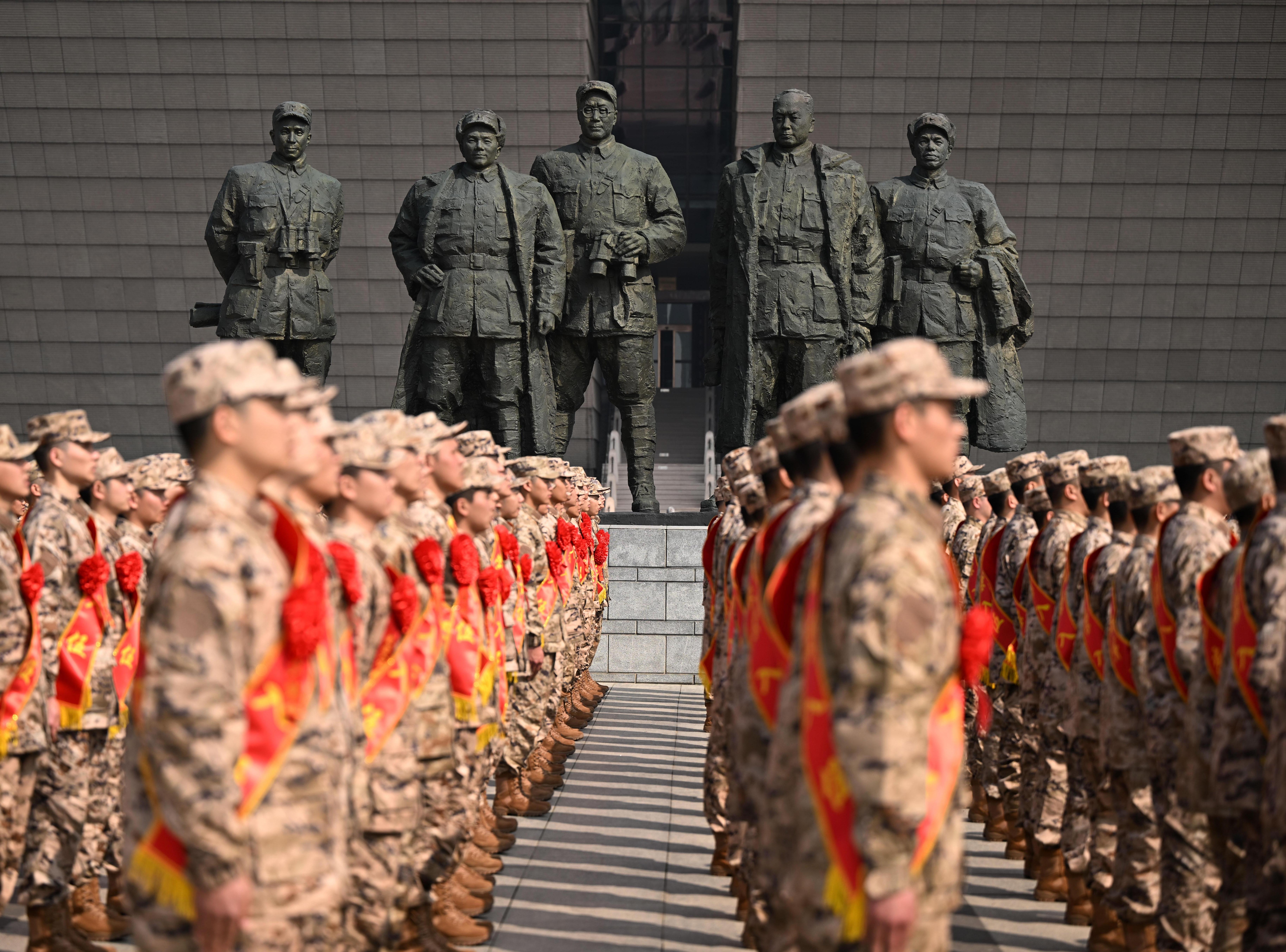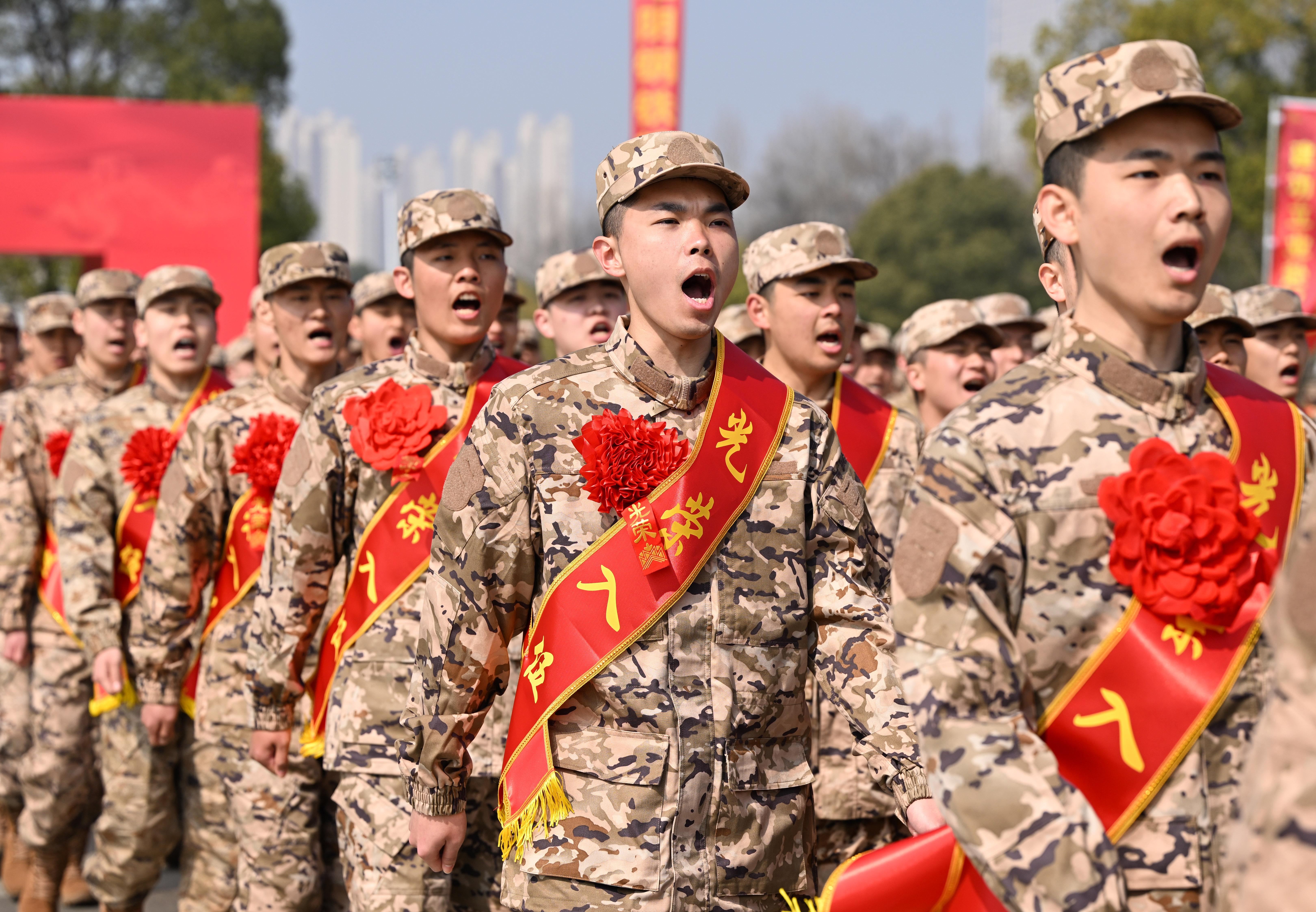 近日,安徽省合肥市在渡江战役纪念馆解放广场举行2026年上半年新兵入伍欢送仪式。在渡江战役纪念馆“五前委雕塑”前,身着迷彩服、胸戴大红花的新战士,整齐列队,带着父老乡亲的嘱托,奔赴军营建功立业。