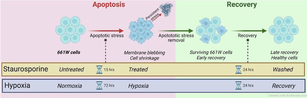 研究团队以小鼠感光细胞为模型,利用化学物质或缺氧环境模拟病理压力,成功激活了凋亡程序。而当压力被解除后,无论细胞处于凋亡进程的哪个阶段,它们都纷纷苏醒过来,其中的关键就是线粒体。