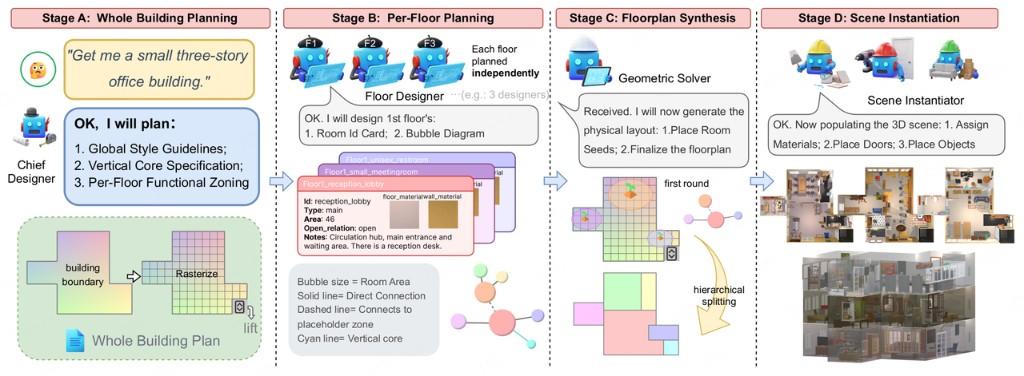 不同于简单的房间拼接,MANSION先对整栋建筑进行功能分区、垂直交通与整体风格规划,再逐层生成拓扑结构与房间布局,通过几何求解生成符合物理约束的建筑平面图,最终输出可直接在仿真器中运行的交互式3D场景。这一方式从源头保证了楼梯、电梯、跨层结构对齐合理,让生成的建筑连贯可用。
