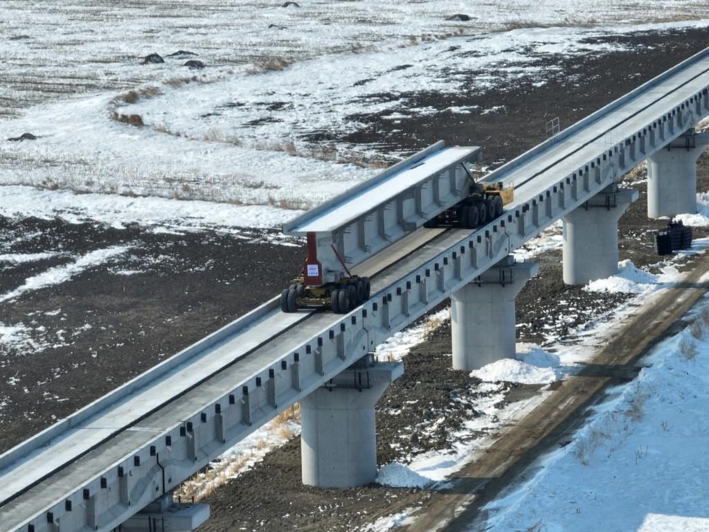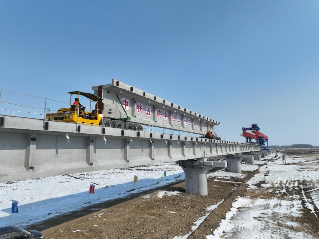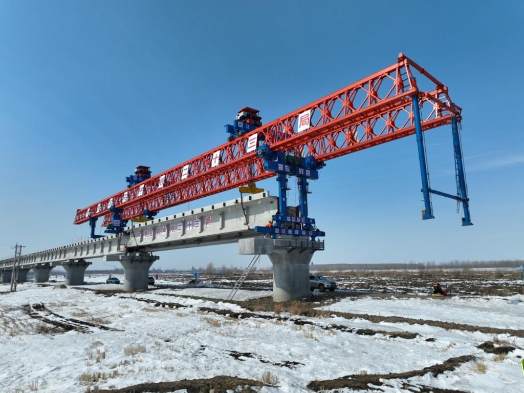 佳同铁路扩能改造工程西起佳木斯市东佳木斯站,终至同江北站,是一条以货运为主,兼顾客运的干线铁路,改造线路全长258.25公里,是我国中欧班列“东通道”的重要组成部分。此次复工建设的同江特大桥位于同江至同江北改建段,是全线“控制性工程”,桥梁全长10435.14米,采用单线T梁结构设计,是我国目前中欧班列西部、中部、东部三大通道中口岸段最长新建桥梁。该桥由中铁第五勘察设计院(铁五院)设计、中铁二十三局承建。在项目规划设计阶段,为节约中国重要商品粮基地——三江平原地区宝贵的黑土地资源,建设团队确定了“外绕城市+以桥代路”的设计方案,该段线路桥梁占比高达84%,共计需要架设650片铁路T梁,于2025年9月开始架梁施工作业。