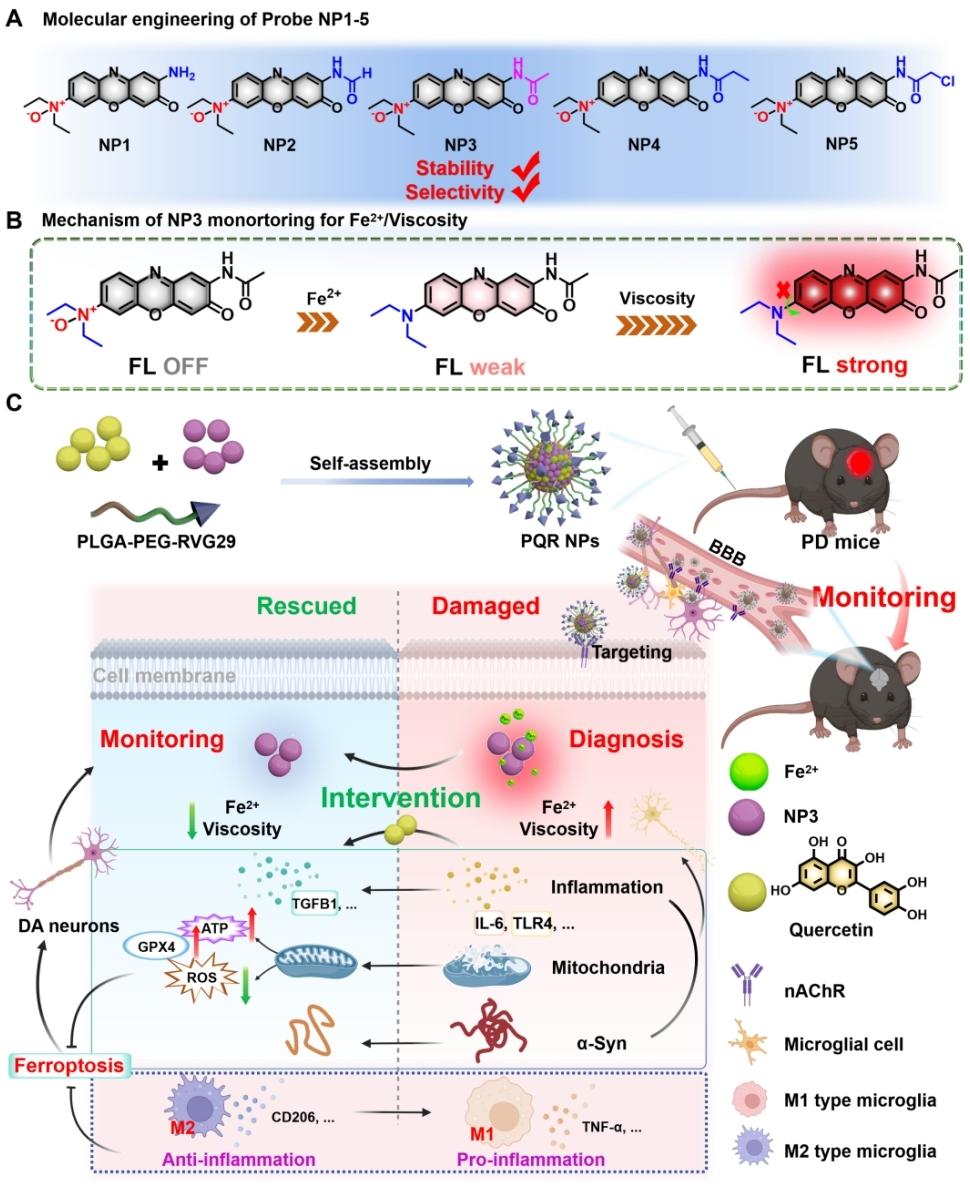 团队将两者结合,构建出新型纳米平台PQR NPs,成功解决了槲皮素的应用难题,同时让这个纳米平台兼具了双重功能。一方面,它能依靠NP3近红外荧光探针持续监测帕金森病模型中铁死亡相关的亚铁离子和黏度变化,为疾病诊断和干预效果评估提供直观、实时的依据;另一方面,平台搭载的槲皮素能通过多种途径发挥作用,抑制铁死亡、减轻脑部炎症、保护多巴胺能神经元,有效干预帕金森病的进展。