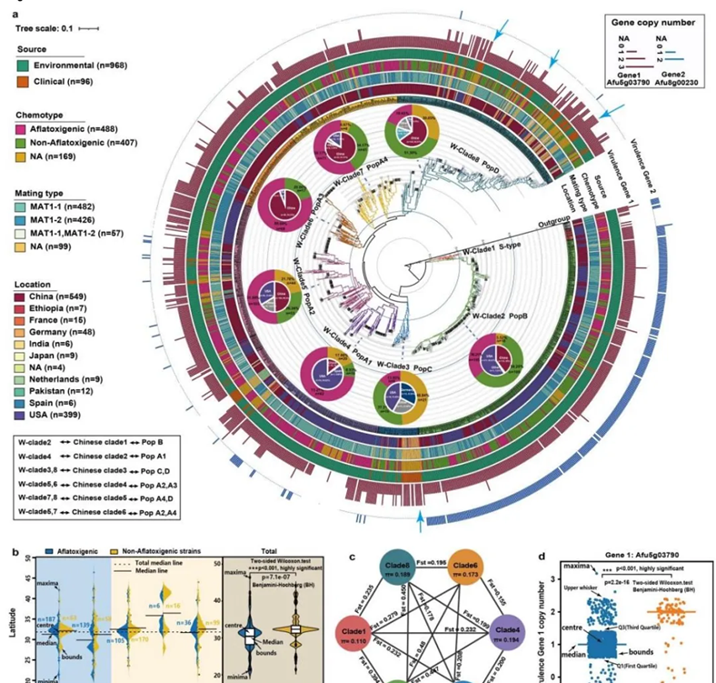为此,团队整合了全球四大洲1052株黄曲霉菌株资源,构建世界规模最大的黄曲霉菌多组学数据集,并开展系统发育、基因组学、代谢组学及环境关联分析。