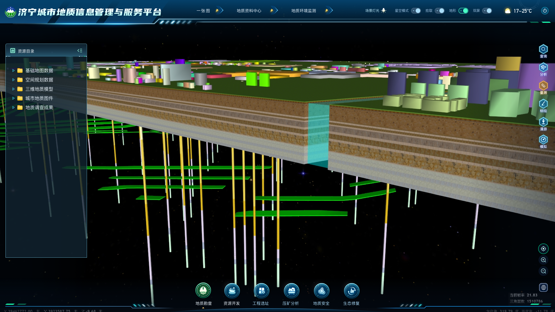 依托强大的硬件支撑,该院打造出覆盖鲁南地区、多要素多类型的实景三维与地质三维数据库,数据总量突破200万条。同时,该院依托一系列高端平台,将零散分散的地质数据,整合转化为标准化、可开发、能产生效益的优质资源,构建起“标准化—资源化—产业化”的数智化发展新格局。