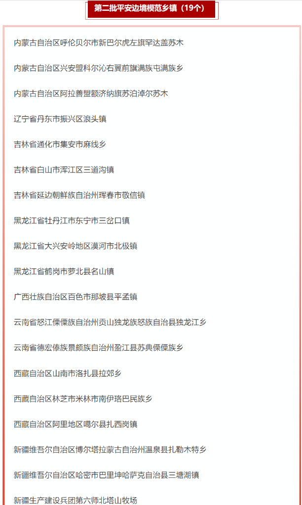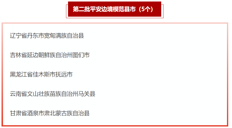 记者从国家移民管理局获悉,3月24日,由国家移民管理局、国家民委、农业农村部、国家边海防委员会办公室联合部署开展的平安边境模范创建活动在京举办平安边境模范县市乡镇经验交流会,辽宁省丹东市宽甸满族自治县等5个县市和内蒙古自治区呼伦贝尔市新巴尔虎左旗罕达盖苏木等19个乡镇获第二批平安边境模范县市、乡镇命名。