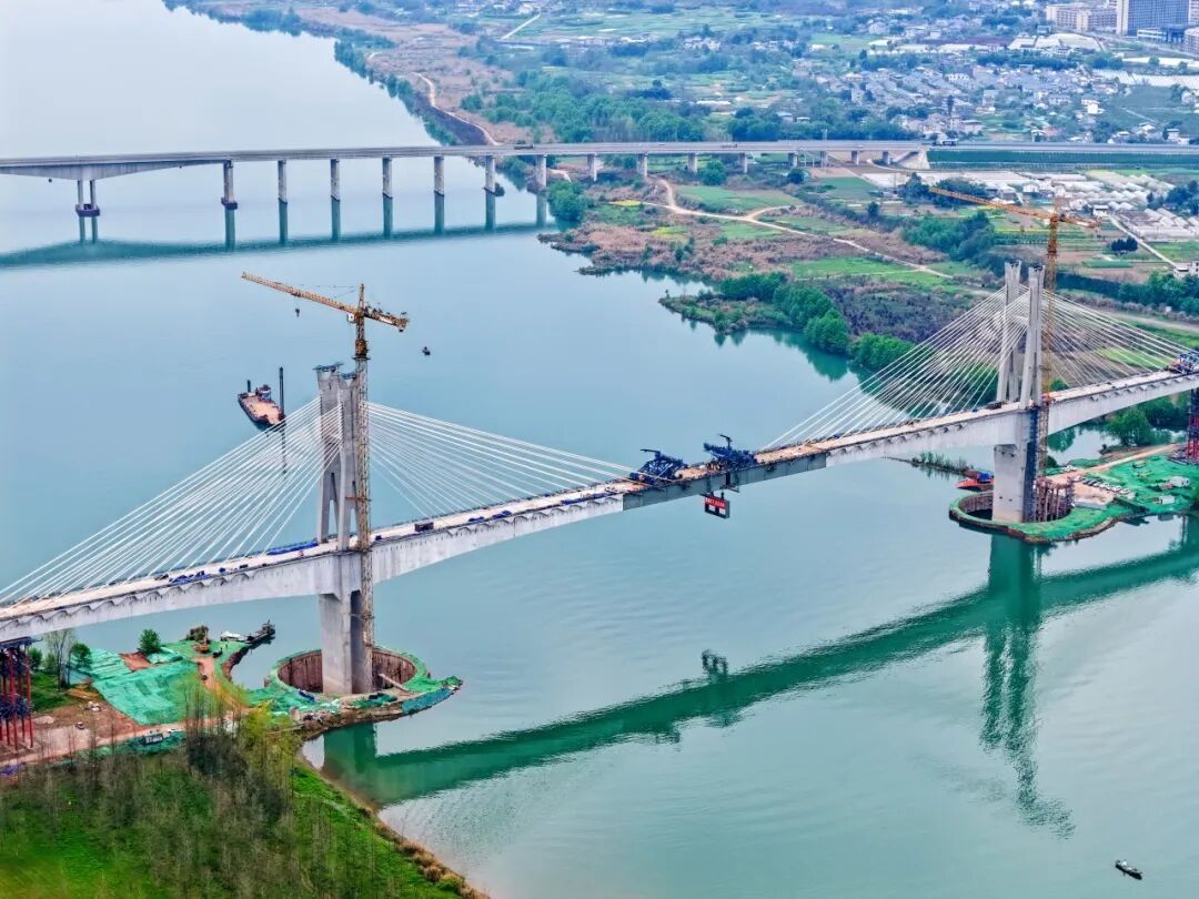 据悉,大桥横跨嘉陵江,连接四川省南充市顺庆区搬罾街道和高坪区龙门街道,全长6225米,主跨长328米,是目前全球时速350公里双线高铁中跨度最大的矮塔混合梁斜拉桥。