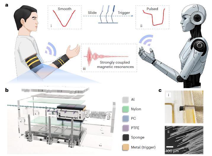 在当前的人机交互与远程操控中,主流可穿戴系统通常需要电池供能,并依赖独立的感知、通信模块协同工作。这种“供能—感知—通信”分立的架构不仅增加了系统复杂性与体积,其长期运行也受限于电池续航,维护成本较高。