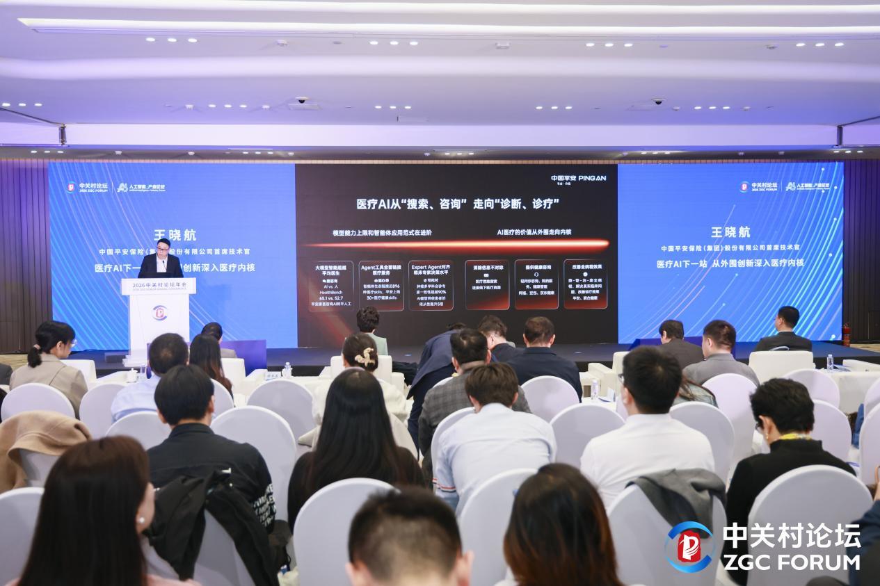 3月27日,在2026中关村论坛年会“人工智能+产业”论坛上,平安集团首席技术官王晓航发表主题演讲,介绍平安AI科技在医疗领域的最新布局和成果。王晓航认为,医疗AI发展范式正在发生根本性迁徙,技术应用正在从医疗外围的信息获取与咨询,深入到诊断与诊疗的内核。