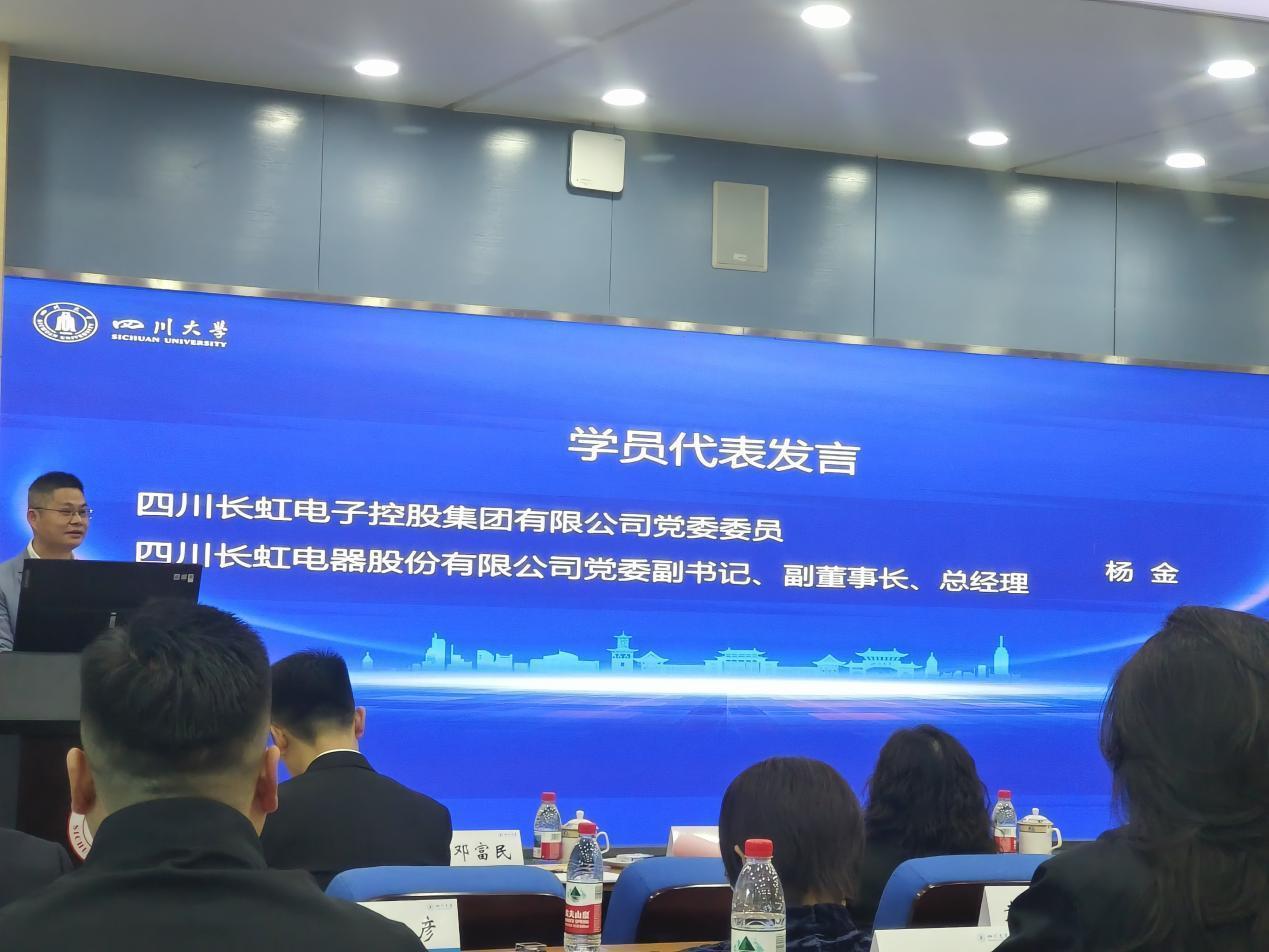 学员代表、四川长虹电子控股集团有限公司党委委员,四川长虹电器股份有限公司党委副书记、副董事长、总经理杨金在发言中表示,将珍惜学习机会,加强交流互鉴,不断提升企业科技创新能力和现代治理水平,更好服务国家和地方高质量发展。