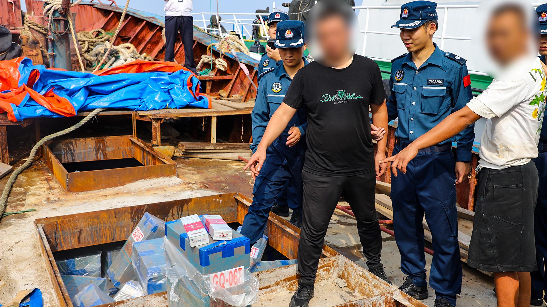 经过数个小时的追踪布控后,包围圈渐渐合拢。眼见时机成熟,执法艇立即拉响警报抵近目标,执法员瞅准时机果断跳帮登船,成功控制以船长周某为首的6名嫌疑人,现场查获5.7万余条来历不明的香烟。