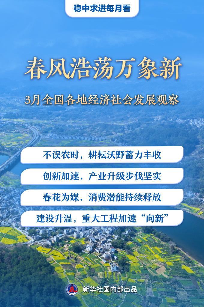 春耕备耕从南向北有序开展,田间地头生机盎然;科创前沿捷报频传,新质生产力动能澎湃;春日经济“热气腾腾”,点燃消费新引擎;重大工程接续发力,项目建设稳步推进……3月以来,全国各地凝心聚力、真抓实干,经济社会发展的脉动愈发强劲。