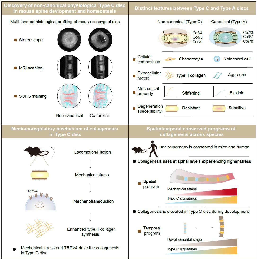 在小鼠模型中,研究者发现,小鼠日常活动时尾部上翘带来的机械应力,会促使特定节段的椎间盘呈现胶原化表型。这一表型从小鼠出生后7天形成,并终身维持。在人体中,该表型同样与高应力区域密切相关——胚胎期为非胶原化状态,成年后达到高峰,这提示,胶原化是脊柱在长期进化过程中形成的,用以适应直立行走后的高负荷。