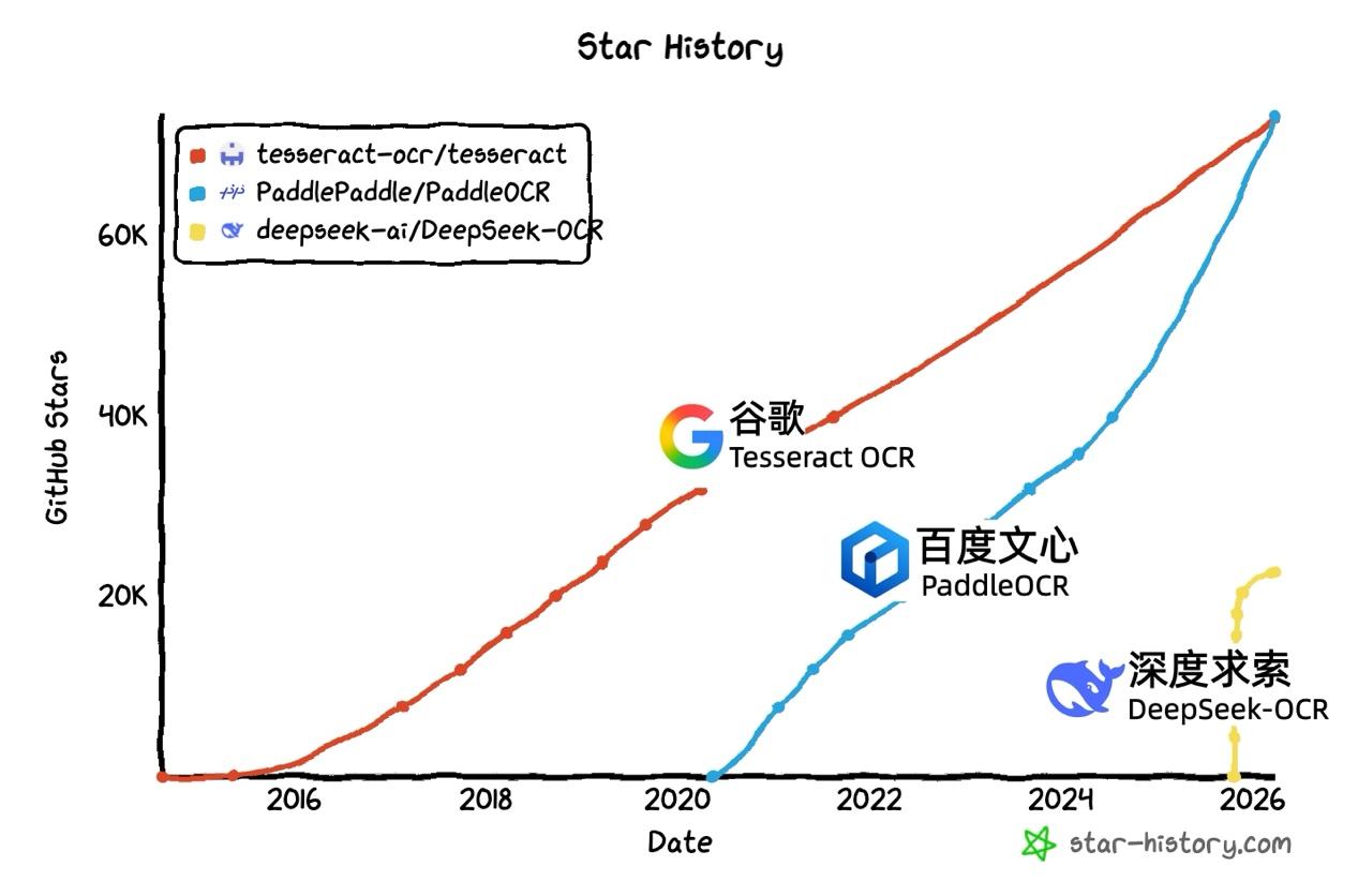 在这一背景下,2025年以来,各家人工智能厂商均在OCR领域加大布局投入。此前的1月底,DeepSeek更新发布了DeepSeek-OCR 2模型,可根据图像含义动态重排图像各部分,模拟了人类观看场景的逻辑流程,使得其在处理复杂图片时更智能、更有逻辑,并且在保持极高精度的同时,严格控制了计算成本。此外,智谱、腾讯混元等也都推出了各自的OCR模型。PaddleOCR在GitHub上的星标数也自2024年起开始爆发式增长。