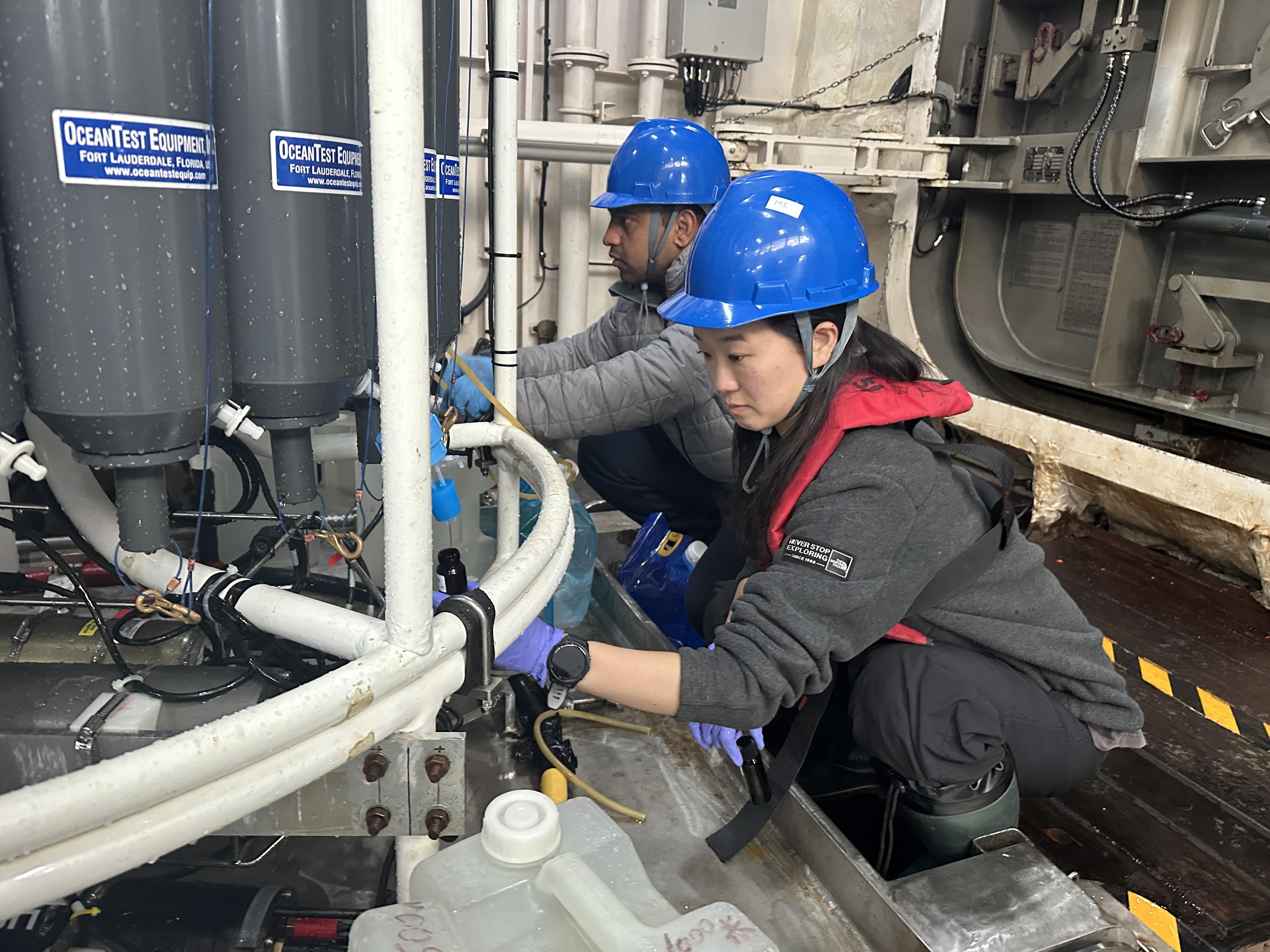 “雪龙2”号月池车间(月池Moon Pool,指船底或平台中间直通海水的大洞,像一口井,用来布放潜水器、钻井设备等)的侧舷门缓缓打开,考察队员顶着陆地少见的风力,将垂直网、颗粒物剖面观测系统、温盐深剖面仪依次下放,去探寻秋季南大洋的奥秘。