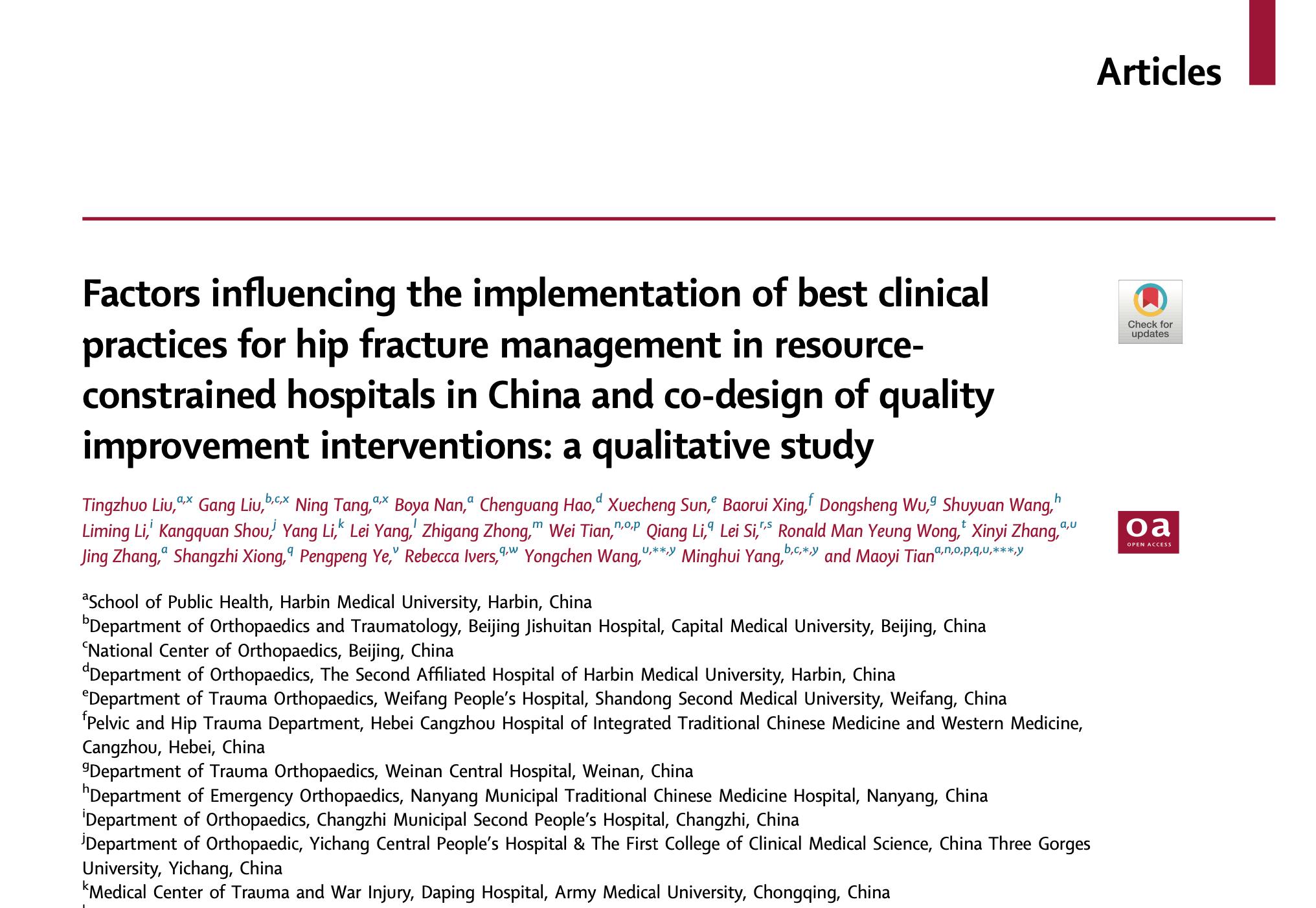 在人口老龄化日趋严重的背景下,老年髋部骨折因高致残、高死亡率成为老年健康的重大威胁。我国县区级医院尤其是医疗资源欠发达地区,对老年髋部骨折及时、有效、高质量救治存在明显短板。就此,首都医科大学附属北京积水潭医院杨明辉教授联合哈尔滨医科大学及哈尔滨医科大学附属第二医院等多家医疗机构,聚焦我国县区级医院老年髋部骨折管理现状开展系统研究,相关成果近日在线发表于国际权威期刊《柳叶刀区域健康(西太平洋)》,为破解基层救治难题、推动优质医疗资源下沉提出了贴合实际的循证方案。