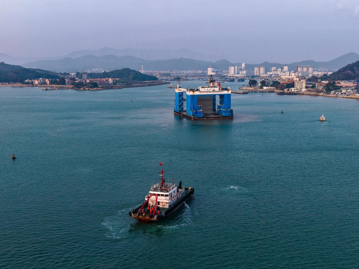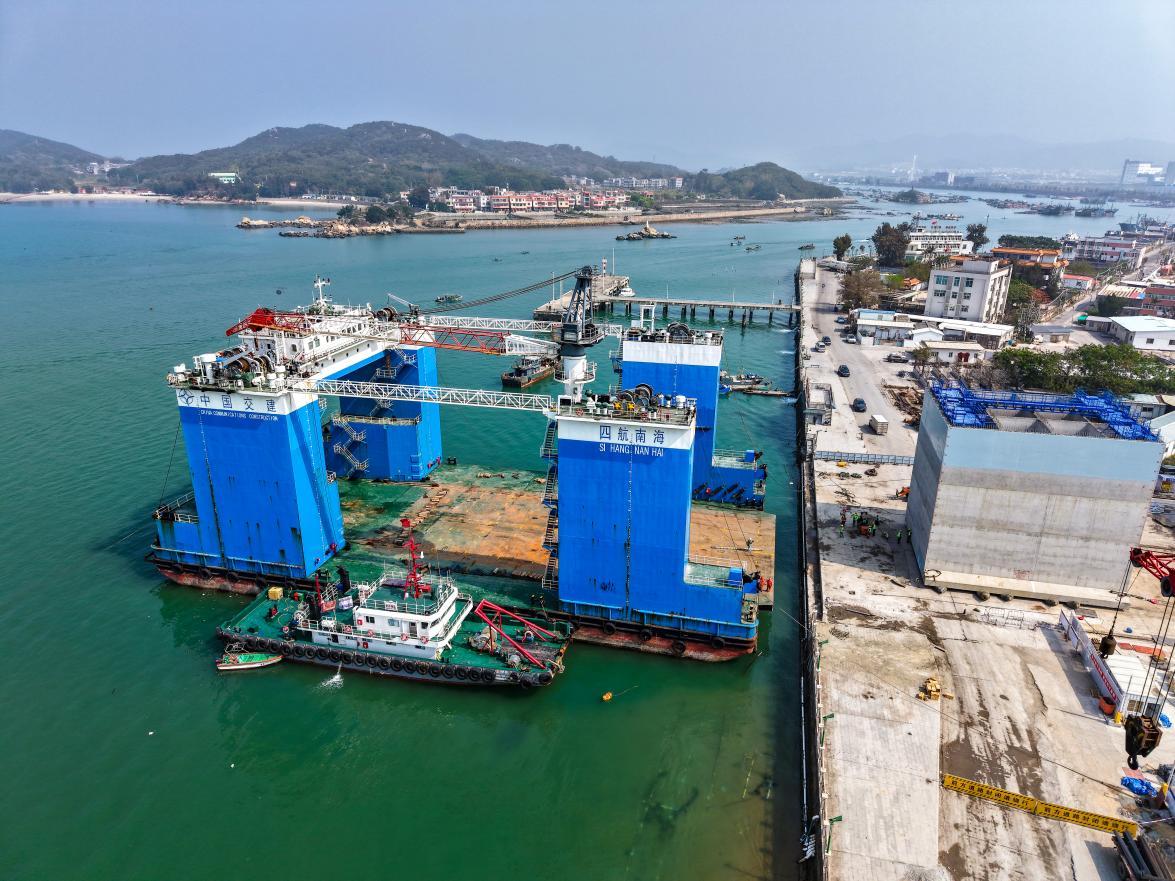 此次安装的首件沉箱体积达1028.8立方米、重约2521吨,是“水域变陆地”的关键一环。“沉箱是非流线型的长方体,在水中的浮运与拖带控制难度极高,同时,安装也受潮汐影响,精度很难控制。”中交四航局项目相关负责人尹建介绍道。