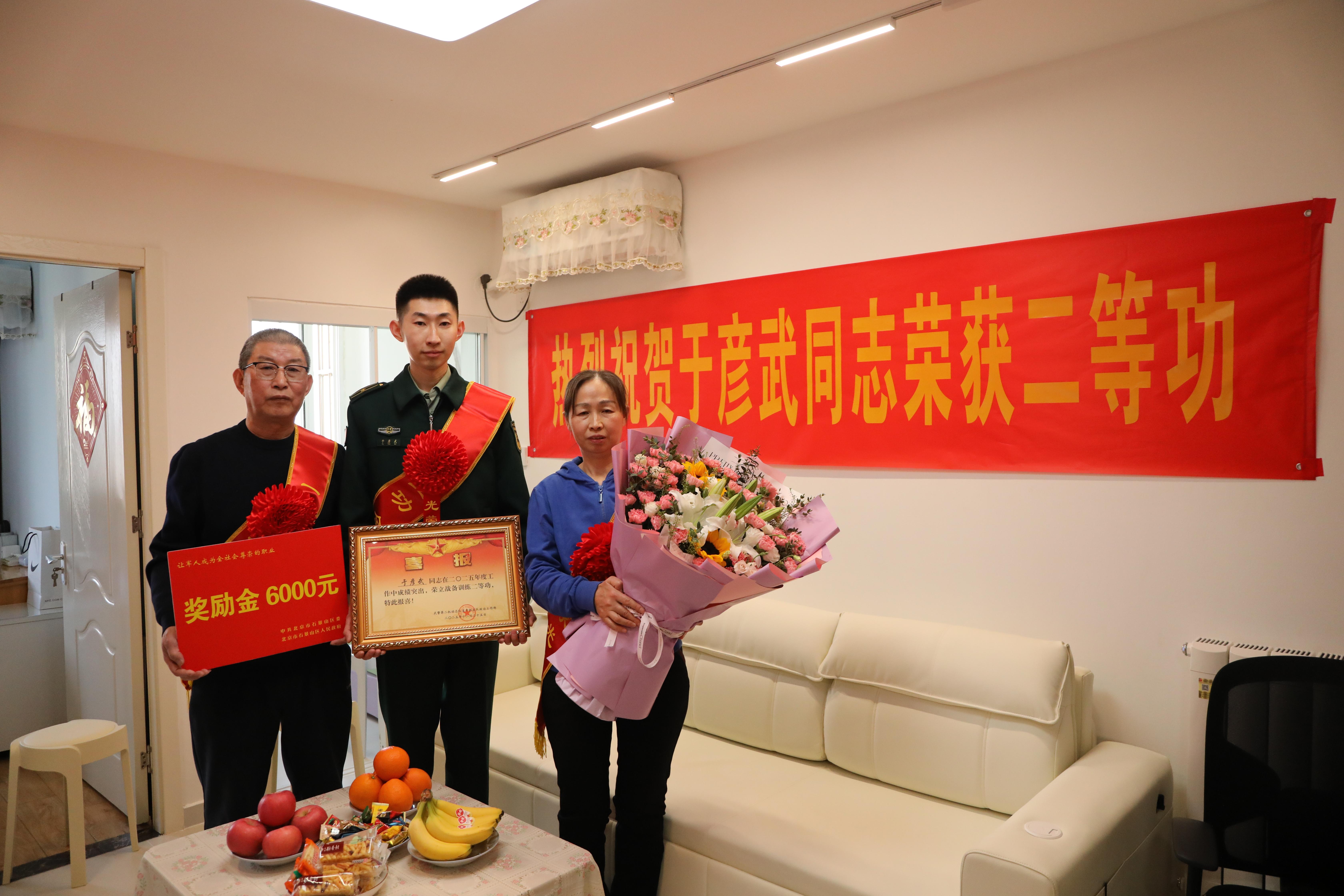 近日,武警第二机动总队某支队、北京市石景山区人武部、区退役军人事务局联合八角街道及社区开展军地联合送立功喜报活动,为荣立二等功的现役军人于彦武家庭送喜报、送荣誉、送关怀,让军属共享军营荣光,切实把党和政府的尊崇与温暖送到军人心坎上。