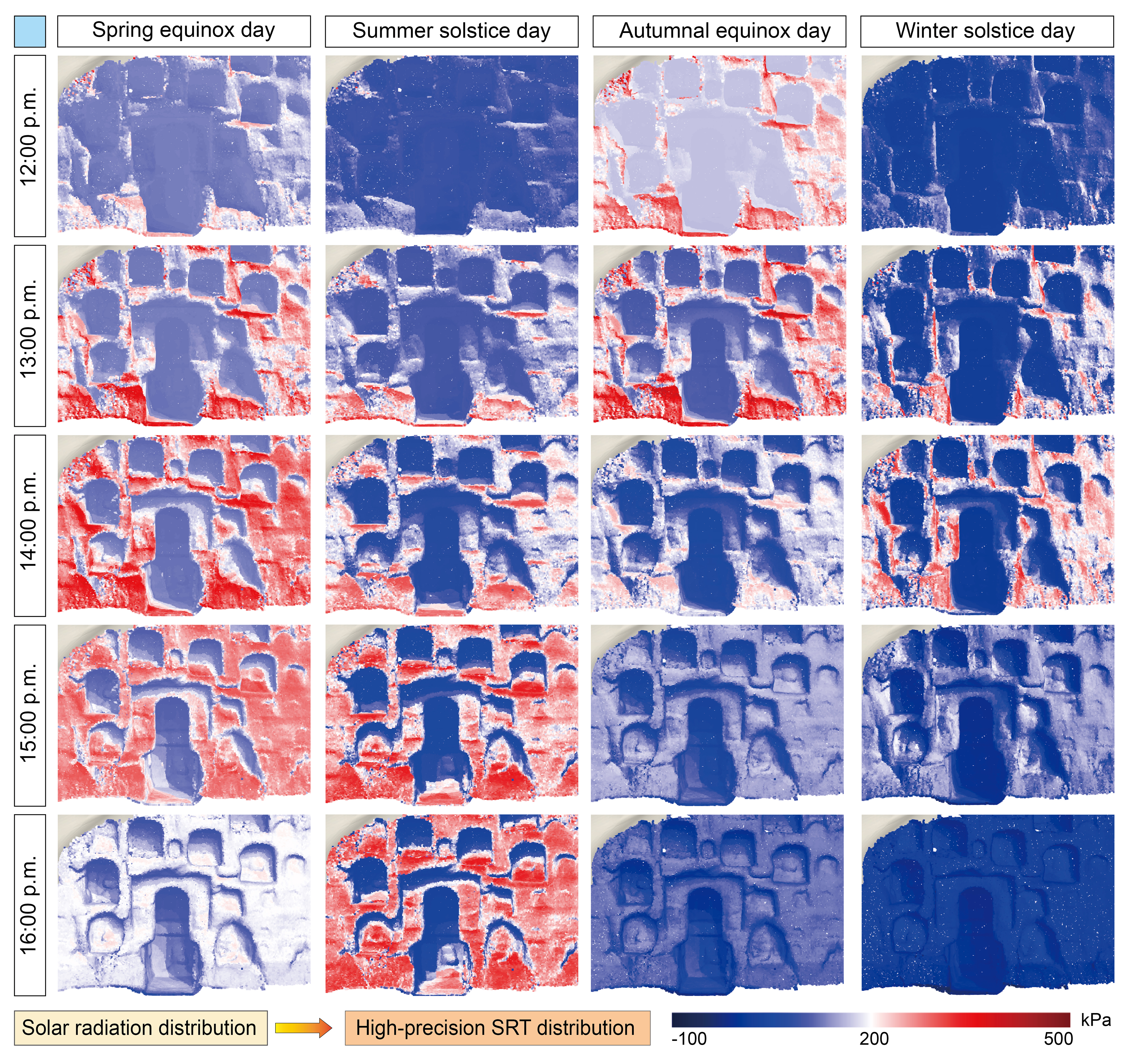 研究团队在典型遗址的实测中发现,冬至与夏至正午附近,不同朝向区域的太阳辐射强度差异最高可达约3倍;凸出部位和边缘过渡带的热应力高达400—500千帕,而相邻阴影区仅为50—100千帕,局部应力梯度差异超过5倍。
