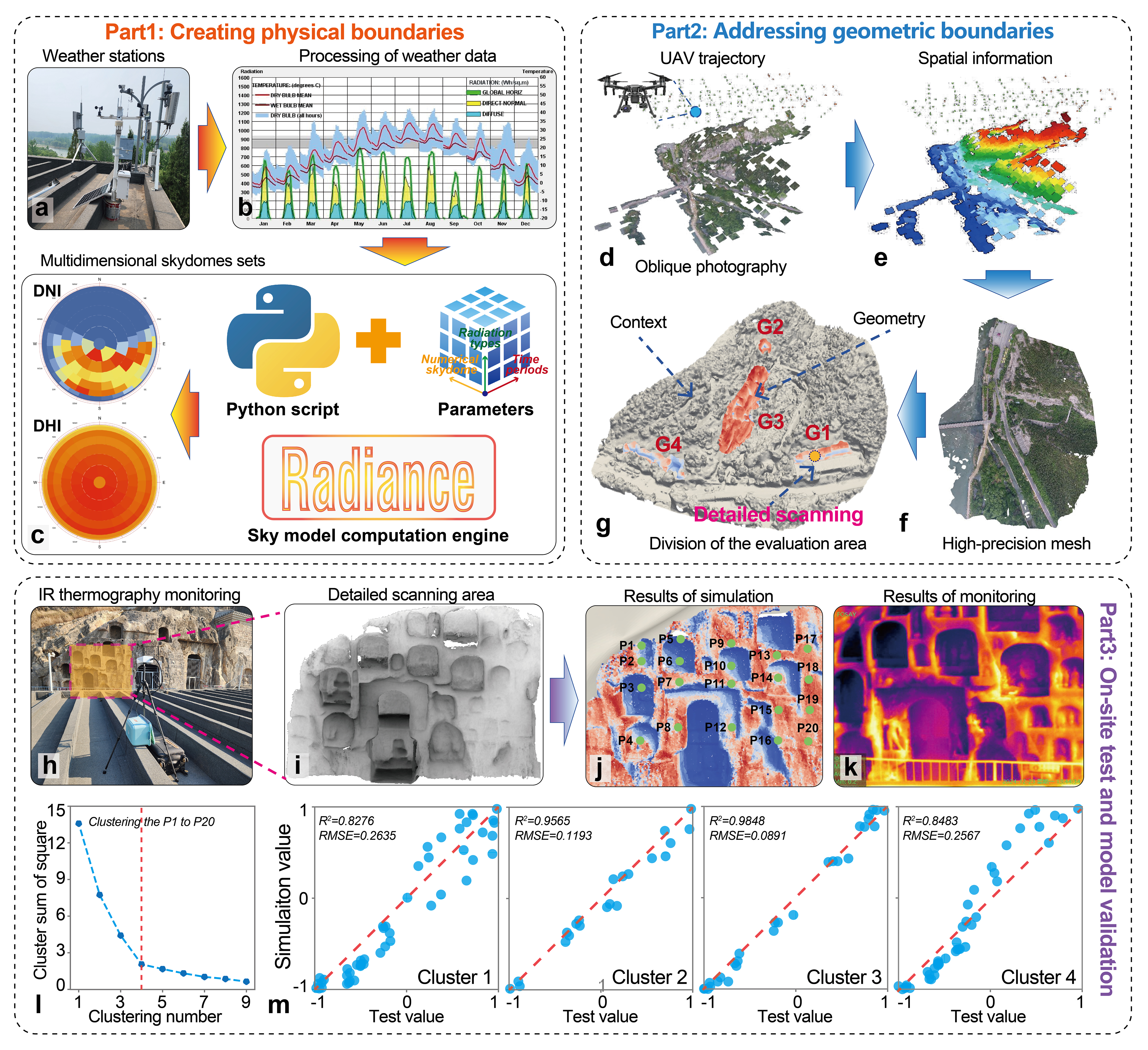 针对“局部分析精细但难顾整体、整体评估粗略又难显细节”的技术瓶颈,研究团队构建了“气象监测—天空模型—三维重建—辐射计算—现场验证”一体化框架。他们在遗产现场布设气象监测设备,结合无人机倾斜摄影与三维重建技术建立高精度几何模型,并通过红外热成像验证,模型决定系数R²平均达0.9216。