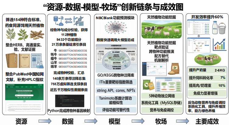 面对领域内数据分散、关联复杂、知识挖掘困难的困境,研究团队建立了中国饲用天然植物活性物质数据库(NBCBank)。“该数据库首创‘天然植物-活性成分-作用靶标-分子功能-养殖效能’‘五位一体’的融合架构,系统整合了154种植物、8000余种活性成分、8525个分子靶标和超过5800万条结构化数据,其中超过80%的反刍动物专用分子互作信息为全球首次规模化、标准化收录。”蒋林树说。