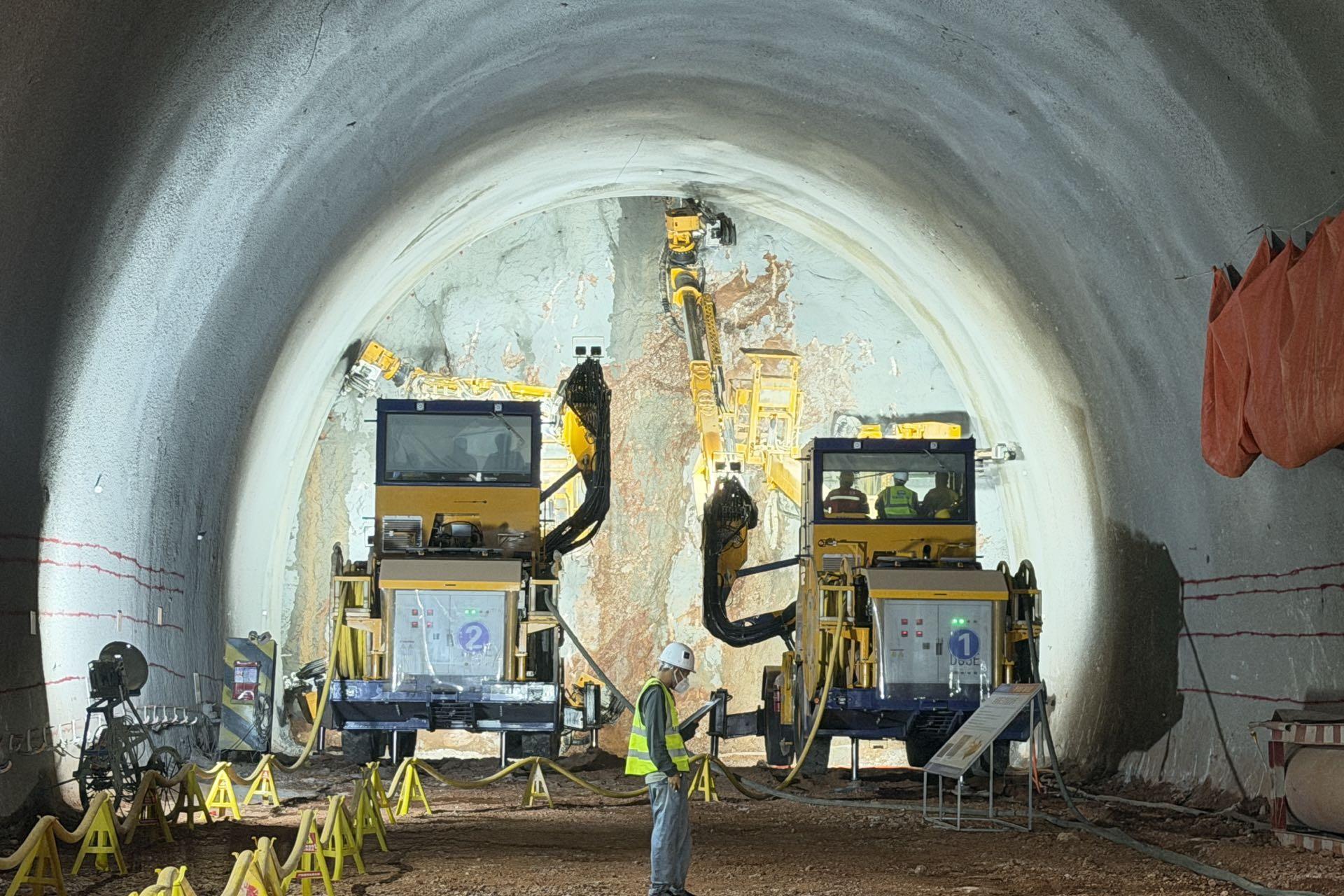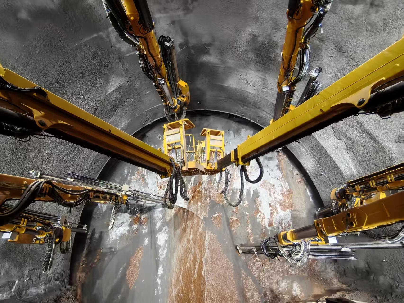据介绍,在开挖阶段,项目部采用2台全电脑三臂凿岩台车“双机并打”作业,设计229个炮眼最短用时67分钟打设完成,平均用时1.5小时以内,大幅降低人工成本及安全风险,提升了施工质量。在初期支护中,成套机械的协同优势更加凸显,钢拱架安装机采用遥控操作,提高了施工精度和效率,降低了安全风险。混凝土湿喷作业采用混凝土湿喷台车双机协同施工,每循环用时3小时以内,提高了工效,缩短了工序时间,提高了施工质量。