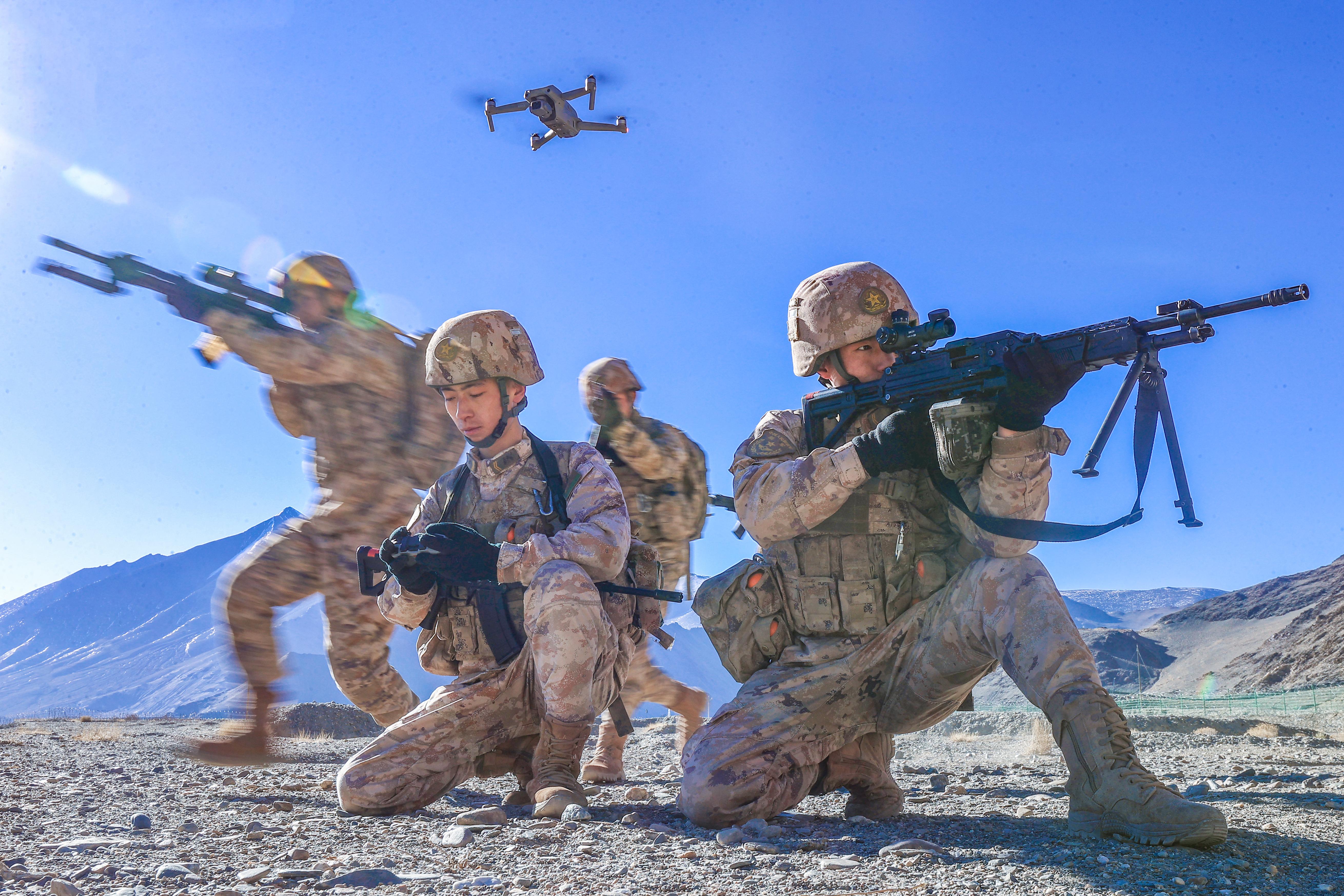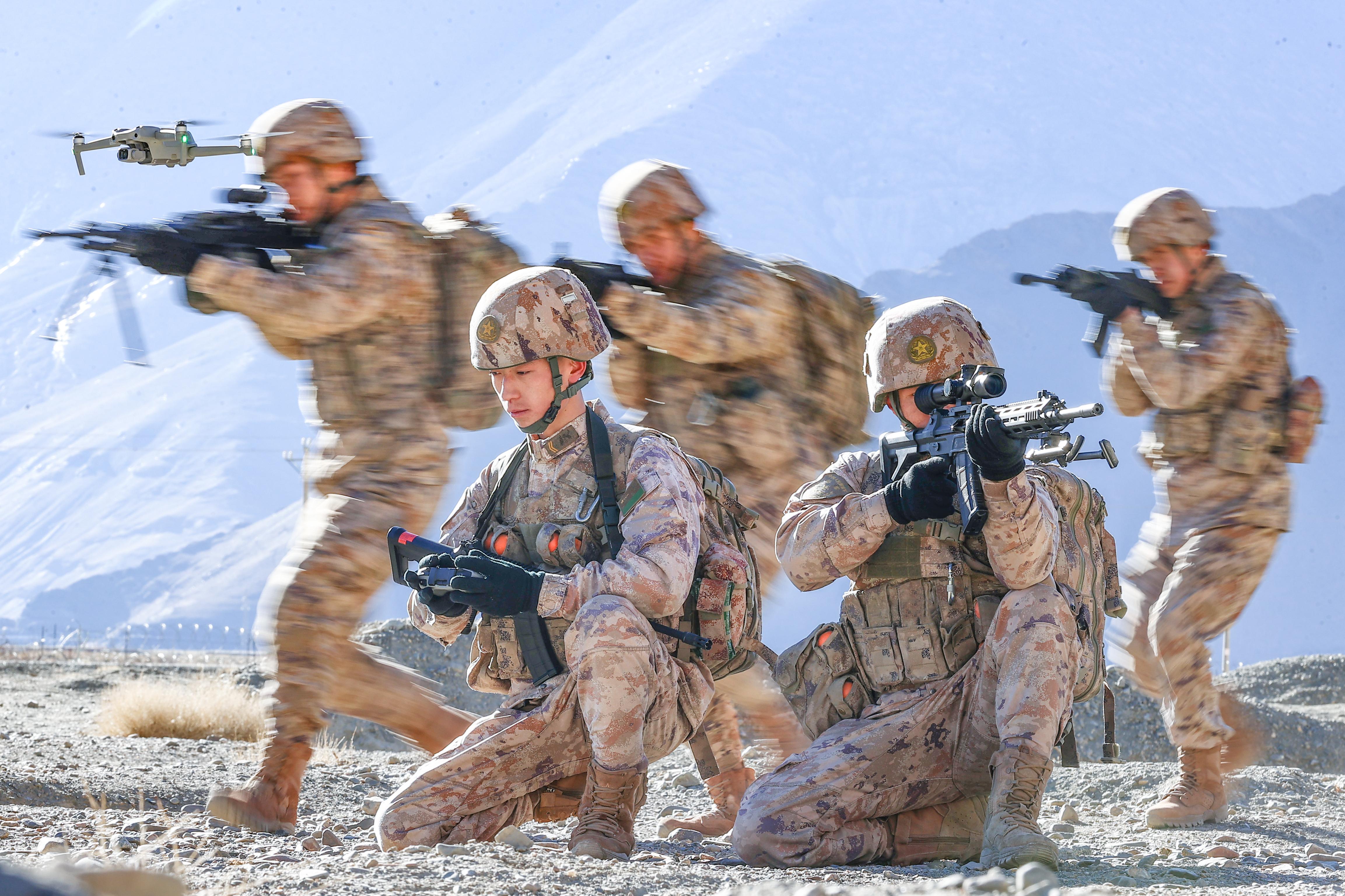 近日,高原腹地,在海拔4200米高原驻训的新疆军区某合成团官兵开展战术协同训练。官兵们利用地形地貌,灵活开展战斗队形,迅速向预定地域实施侦察渗透。