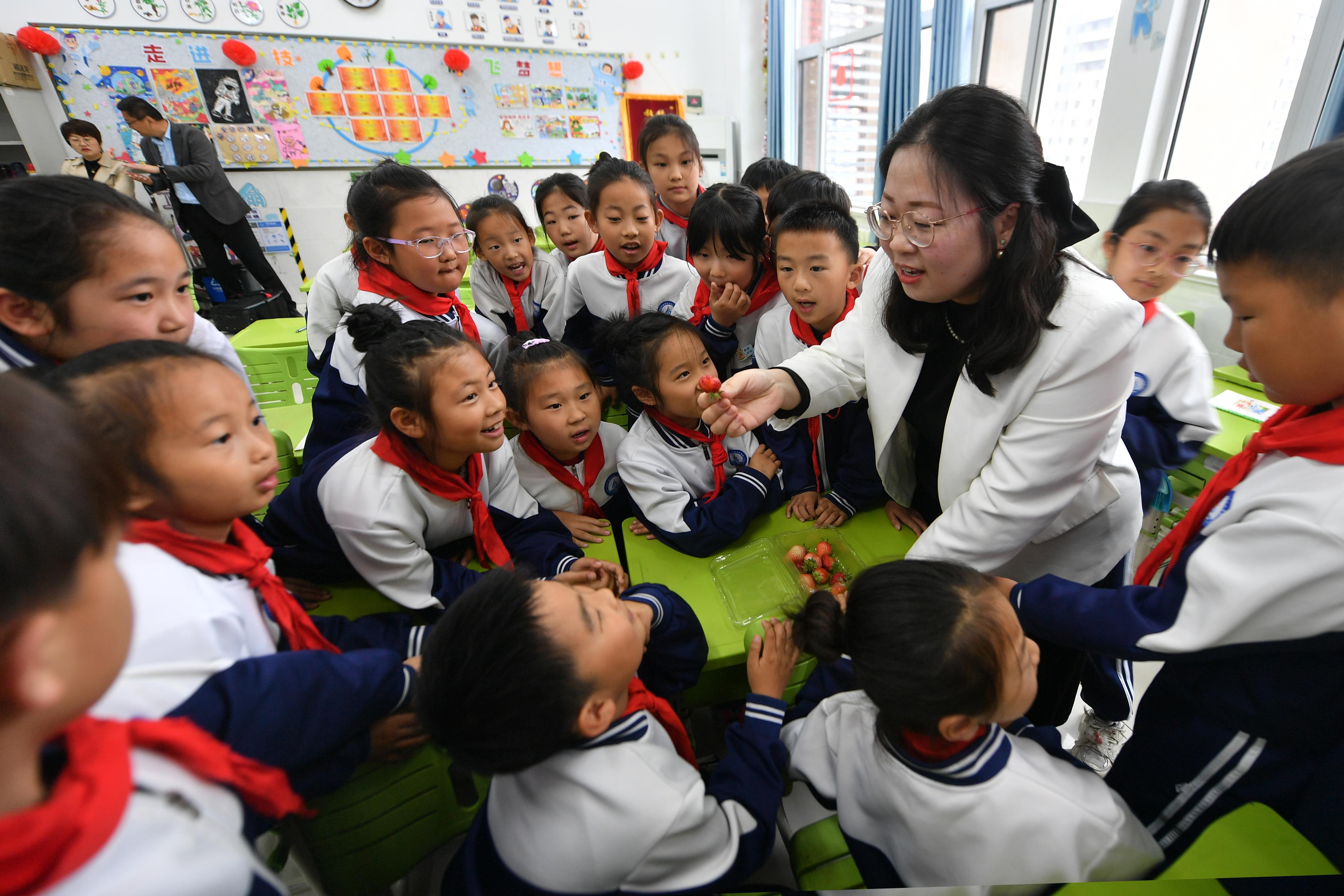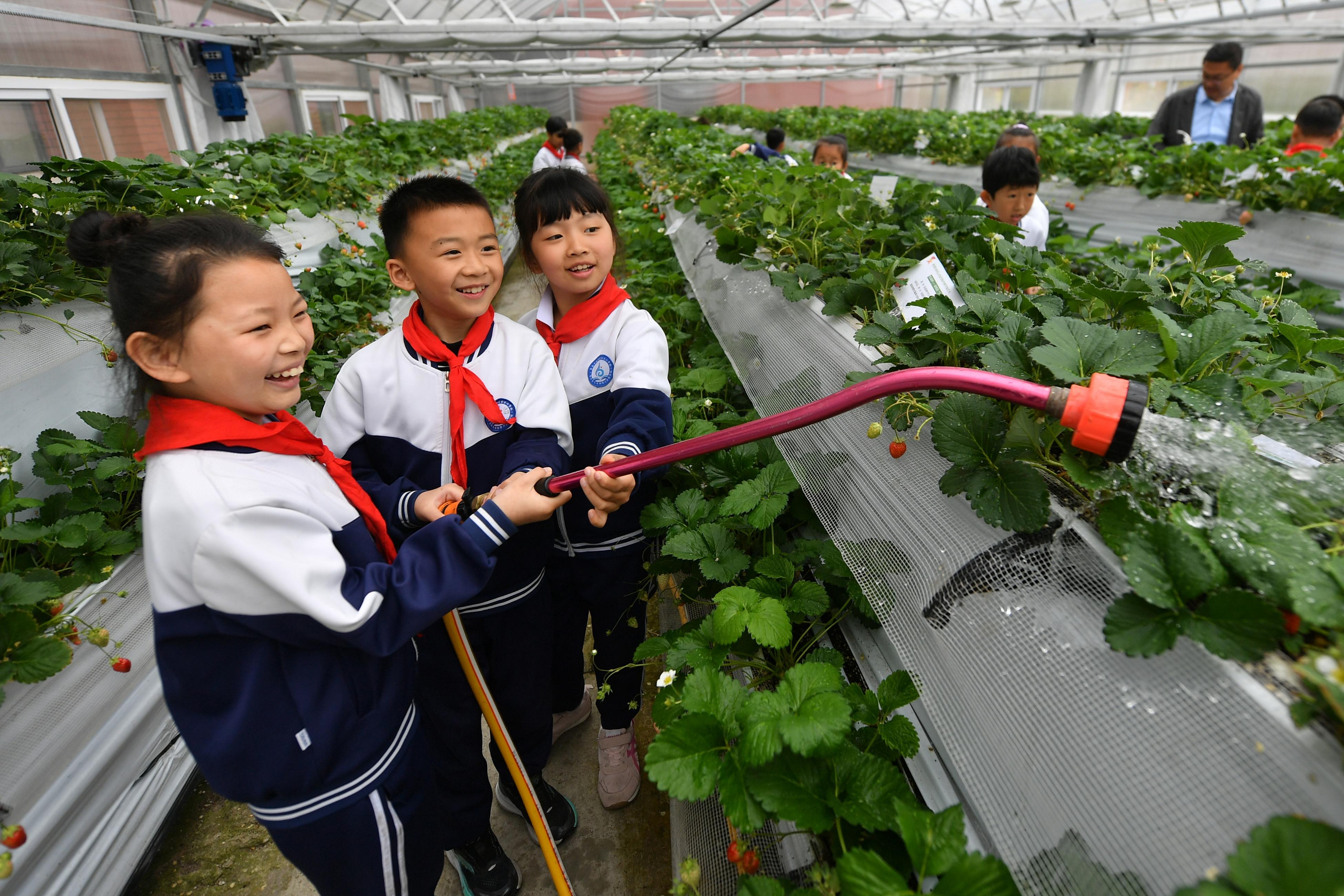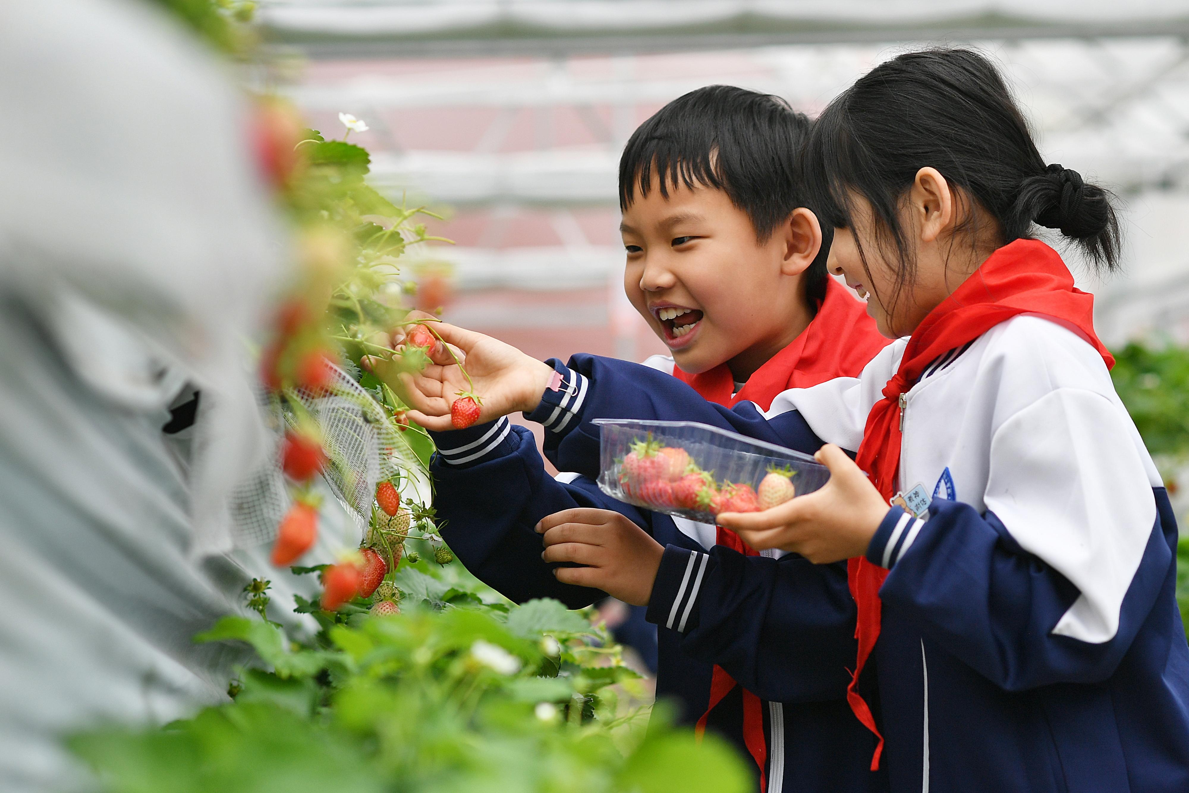春日时节,山东省青岛市城阳区白云山学校的草莓科普基地结出累累硕果。