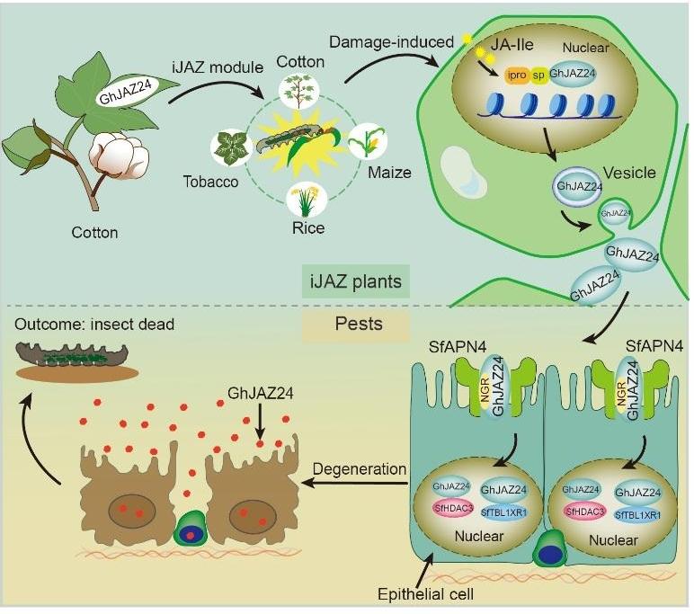 据介绍,iJAZ是李付广团队依托棉花生物育种与综合利用全国重点实验室,在棉花基因工程改良研究中发现的天然植物源抗虫蛋白。iJAZ在棉花、南瓜、榴莲等植物中均存在,对棉铃虫、草地贪夜蛾、稻纵卷叶螟等鳞翅目害虫具有广谱杀虫性,与当前广泛应用的苏云金芽孢杆菌(Bt)杀虫蛋白作用机制完全不同。iJAZ平时处于静默状态,只有当鳞翅目害虫啃食叶片造成损伤时,才会特异识别害虫肠道的特有受体并精准结合,发挥高效杀虫作用。