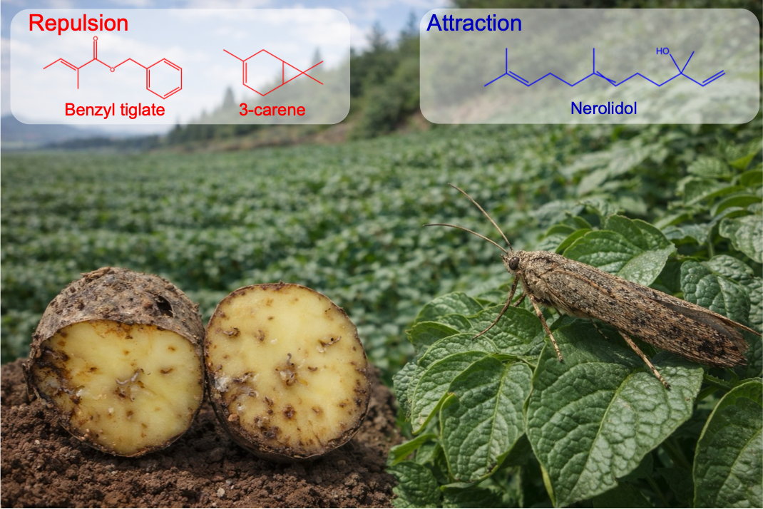 研究团队对46个马铃薯品种开展系统评价,发现不同品种在幼虫密度、产卵量和受害程度上存在显著差异。通过挥发物分析与行为测定,鉴定出多种具有明确行为活性的挥发性有机化合物。其中,反式橙花叔醇、β-紫罗兰酮对雌蛾具有引诱作用,3-蒈烯、惕各酸苄酯表现为显著的产卵抑制或驱避效应。这些关键化合物在马铃薯感虫性品种、抗虫性品种中的相对含量存在明显差异,表明雌蛾是通过识别品种特异挥发物组合来决定产卵去向的。
