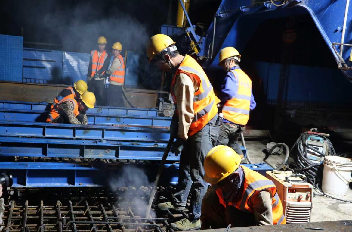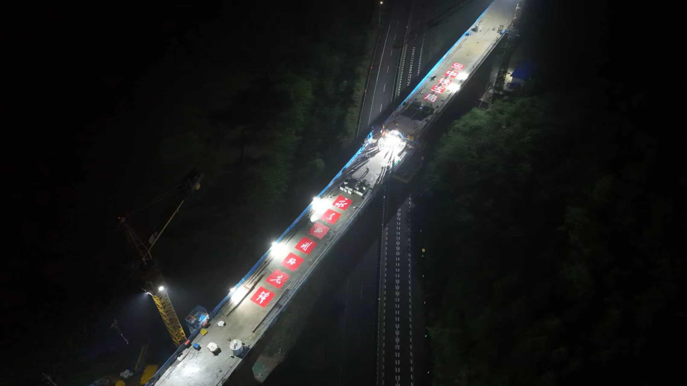 此次浇筑的为中跨合龙段,长2米、梁高5米,混凝土浇筑量为55.3方。为保障中跨合龙高质量完成,中铁五局细化了合龙温差控制、梁体线形监测、混凝土浇筑与养护等关键工序标准。同时,通过采用智能造桥机,搭载多维度传感监测系统,实时采集梁体应力数据、精准控制液压同步作业,显著提升了合龙施工的精度与效率。