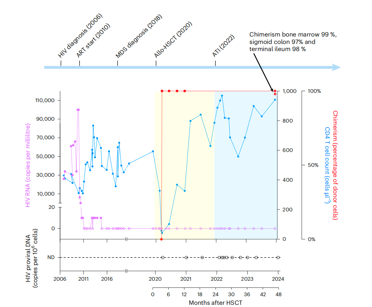 随着时间推移,研究人员发现供体的细胞已取代患者自身的免疫细胞,分布于血液、骨髓和肠道组织中。对移植两年后采集的活检样本进行的分析显示,血液或肠道样本中均未检测到HIV前病毒DNA,即整合到受感染细胞宿主DNA中的病毒遗传物质。