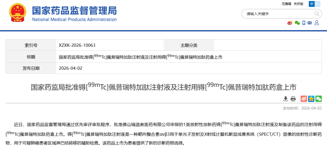 近日,北京协和医院牵头Ⅰ期至Ⅲ期临床试验的我国自主研发全球首创(first-in-class)放射性新药——锝99mTc佩昔瑞特加肽注射液(99mTc-3PRGD2)及制备该药品的注射用锝99mTc佩昔瑞特加肽药盒获国家药监局批准上市。该药主要用于肺癌患者淋巴结转移的辅助诊断,是我国首个自主研发的放射性1类创新药,也是全球首个批准的针对整合素αVβ3靶点的药物,标志着我国在核药领域实现了从0到1的原创性突破。