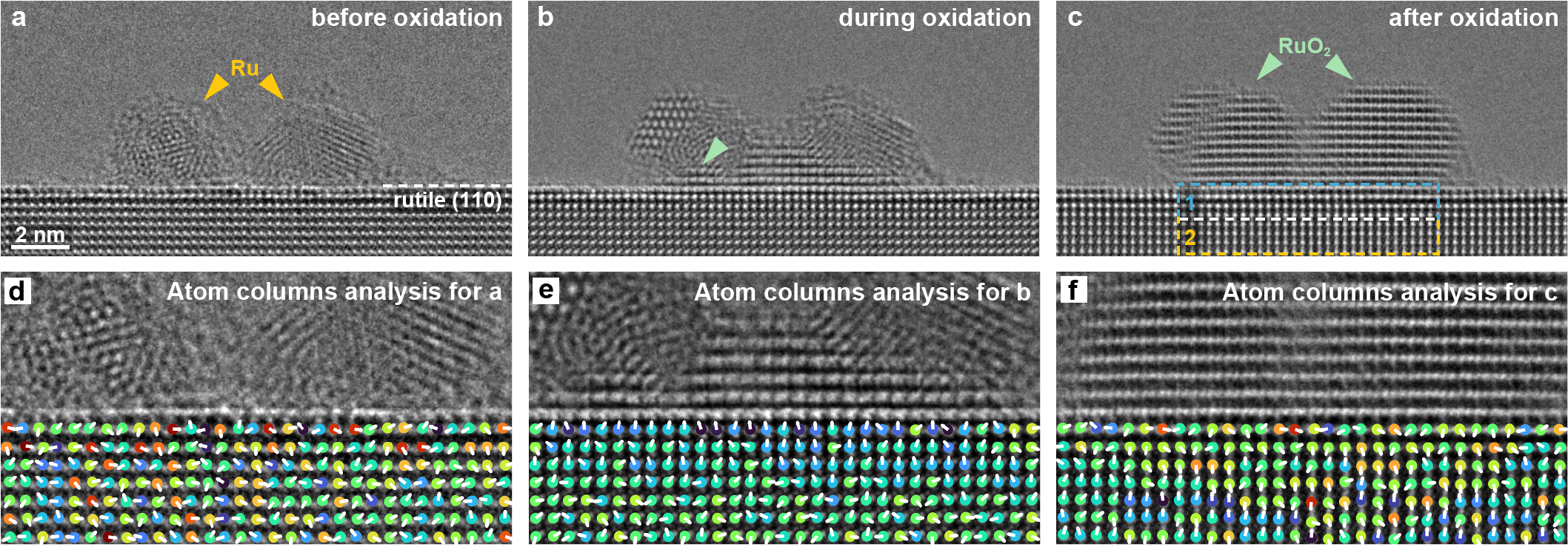 截至目前,科学家对催化剂表面的溢流行为已有深入认识,但关于负载型金属催化剂的体相,特别是金属/载体界面是否存在类似的溢流过程,以及其如何影响催化反应仍是未解之谜。对此,研究团队聚焦于高性能负载型钌基催化剂的研发,利用原子分辨环境透射电镜,从原子尺度原位解析了金红石型二氧化钛中钌单颗粒的氧化机制,并首次在该过程中观测到体相氧溢流,证实了载体中的晶格氧以空位介导的方式通过界面输运至金属颗粒。与此同时,团队还建立了皮米精度原子应变矢量分析方法,高分辨定量解析了氧溢流的行为,并追踪到界面持续氧输运所引发的载体局域晶格动态应变,进而揭示了金属/载体界面对体相氧溢流的调控作用,阐明了界面结构适配是体相氧溢流通道畅通的保障。这种机制被证实广泛存在于氧化物相低晶格失配度的金属/载体界面催化剂体系中,并在催化反应中发挥关键作用。