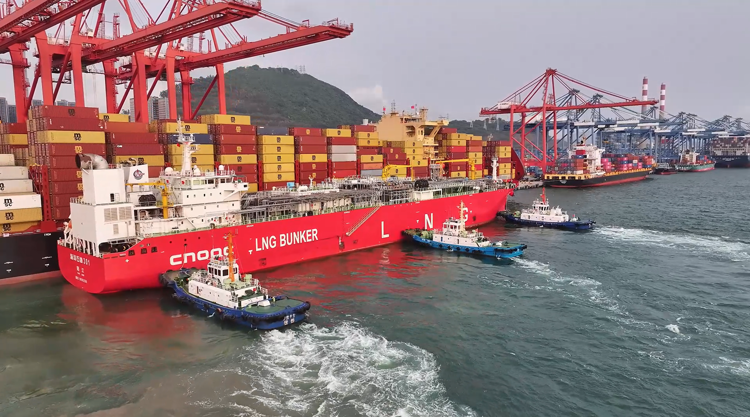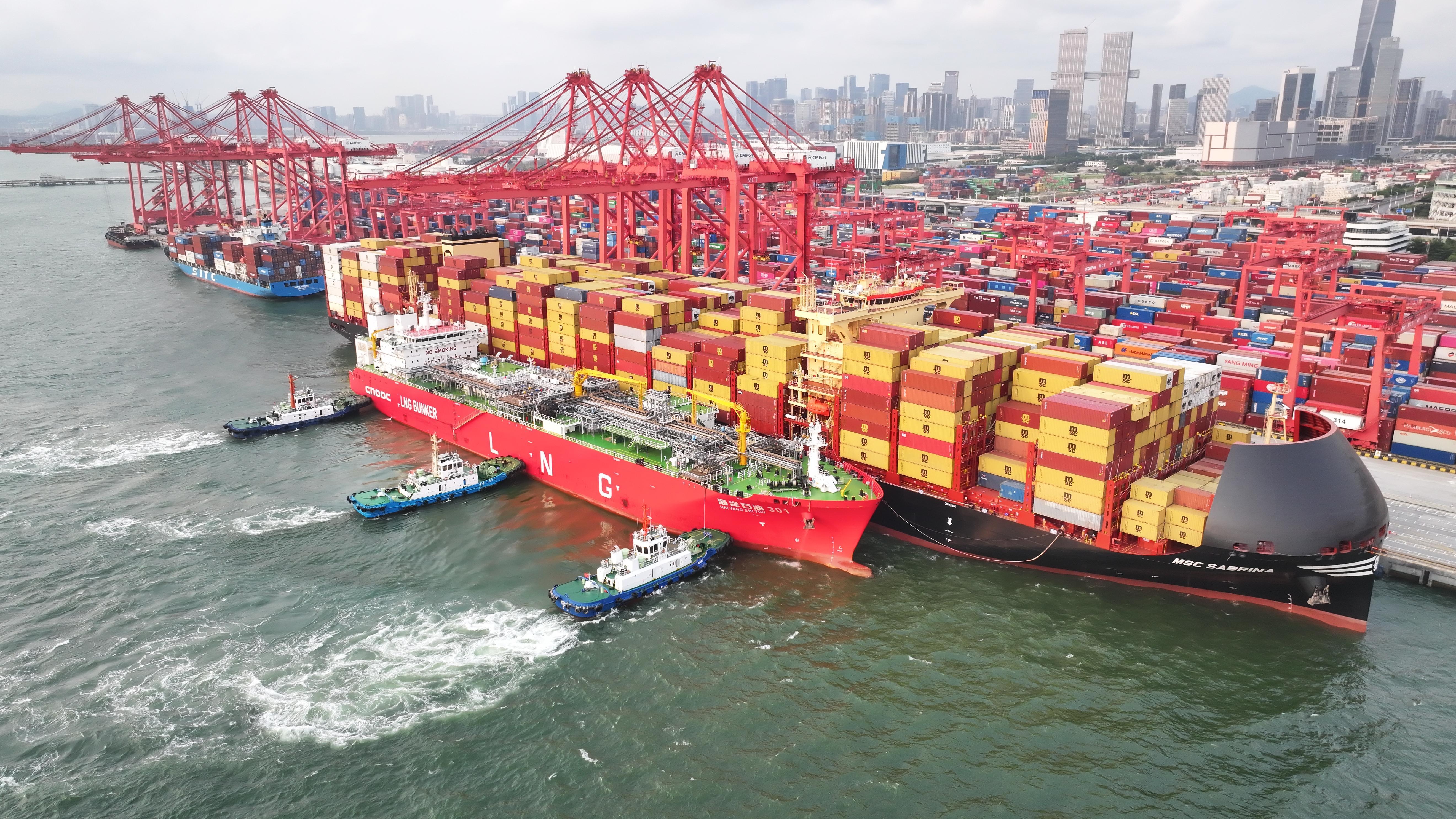 4月15日傍晚,在深圳妈湾智慧港4号泊位,全球最大的LNG运输加注船“海洋石油301”轮开始为外轮“MSC SABRINA/地中海塞布丽娜”实施液化天然气加注作业,这也是“海洋石油301”轮首次在深圳西部港区作业。此次加注作业持续至4月16日上午,预计加注量可达2291吨。