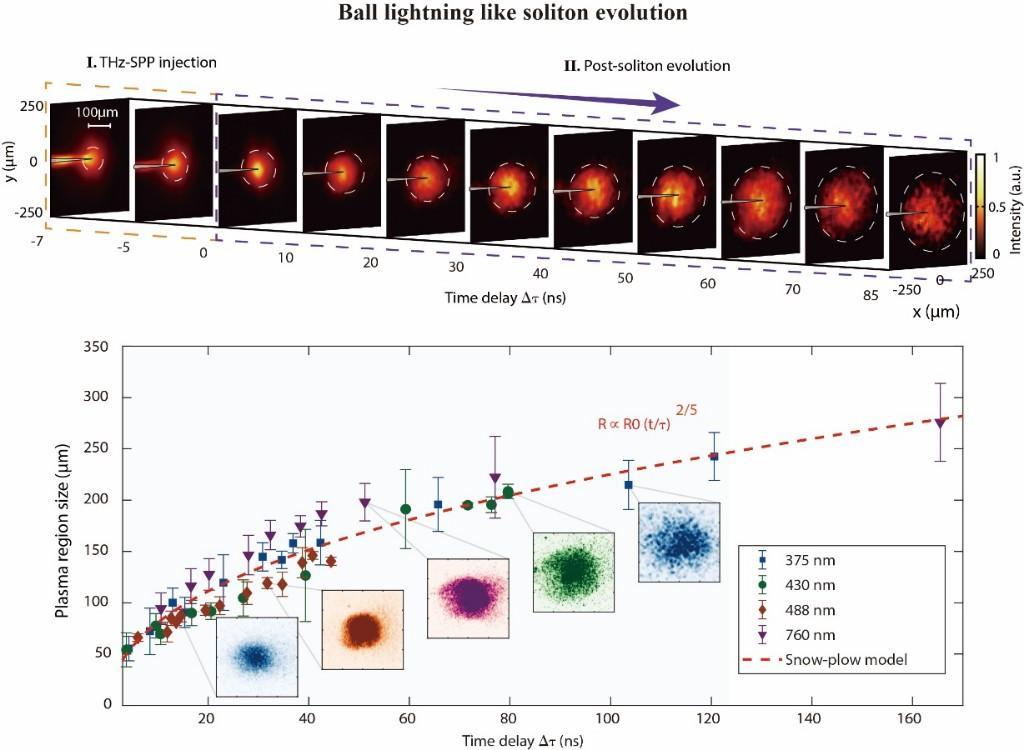 研究团队在强激光驱动太赫兹源领域长期深耕,自主搭建时空分辨诊断系统,实现孤子全过程精准观测。实验室中,高速摄像机捕捉到:明亮白球被幽蓝等离子体外壳包裹,如“光之茧”般缓慢膨胀、最终耗散。该电磁孤子直径约百微米、寿命达百纳秒,光谱覆盖紫外至红外宽波段,经物理标度变换,可对应自然界直径几十厘米、持续数秒的球状闪电。
