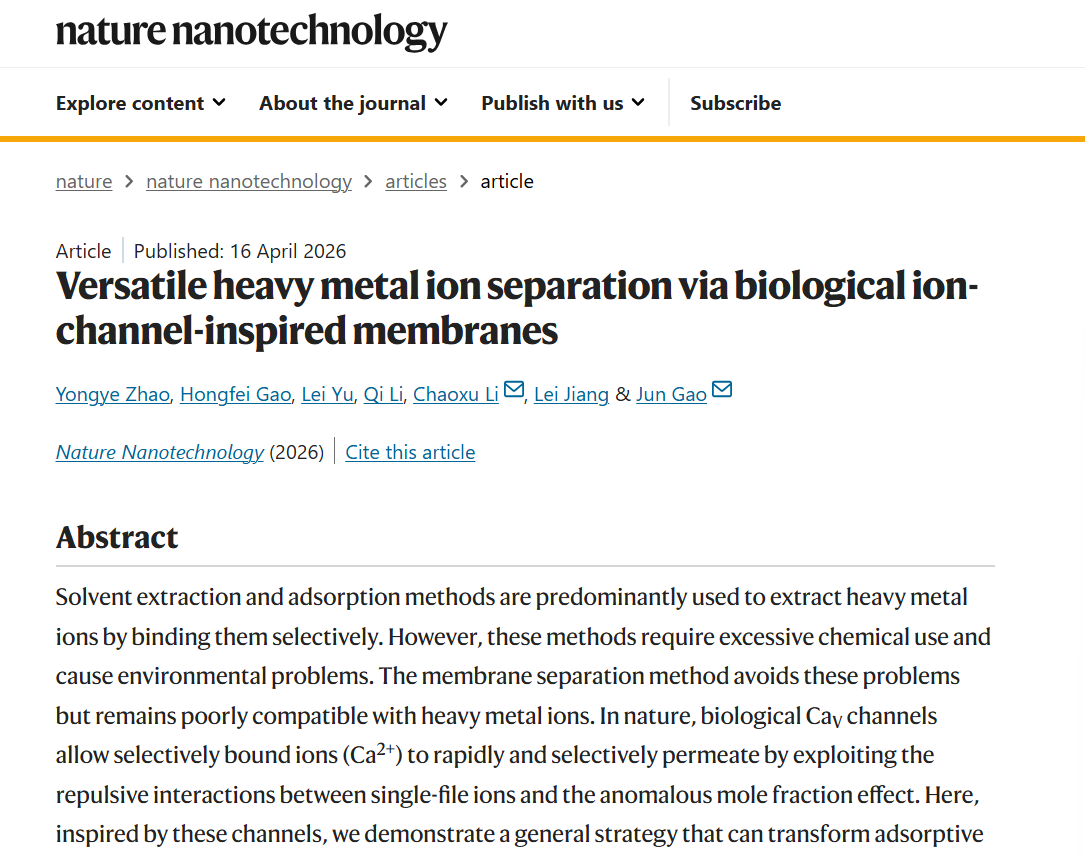 4月17日,记者从中国科学院青岛生物能源与过程研究所获悉,该所联合江汉大学、中国科学院理化技术研究所,开发出一种普适性关键金属离子膜分离方法,可高效、绿色、有选择性地提取铀、铜、金等关键金属资源。该方法有望解决传统关键金属资源提取技术高污染、低效率、高能耗的难题。相关研究成果于4月16日发表在《自然·纳米技术》上。