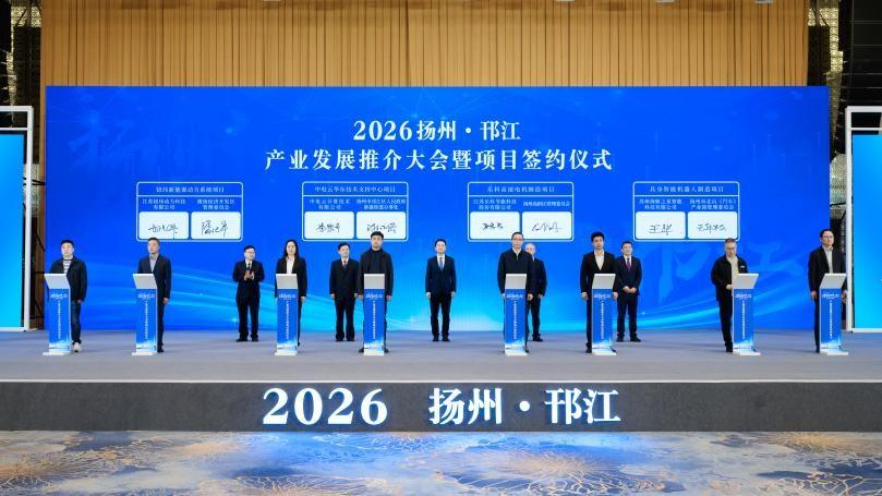 4月17日,2026扬州(邗江)产业发展推介大会暨项目签约仪式在江苏扬州举行。活动现场集中签约项目28个,涵盖生物健康、微电子、高端装备制造、新能源、数字经济等多个产业领域。在此基础上,邗江区还有8个项目将参加市级签约活动,计划总投资近100亿元。