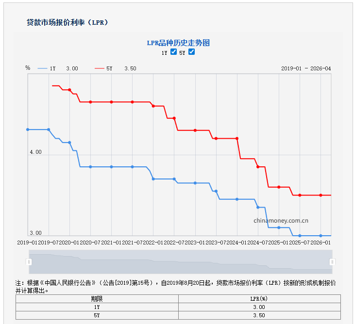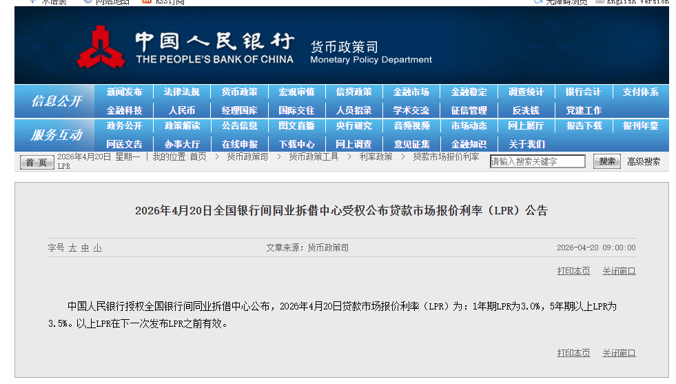4月20日,中国人民银行授权全国银行间同业拆借中心公布,2026年4月20日贷款市场报价利率(LPR)为:1年期LPR为3.0%,5年期以上LPR为3.5%。以上LPR在下一次发布LPR之前有效。