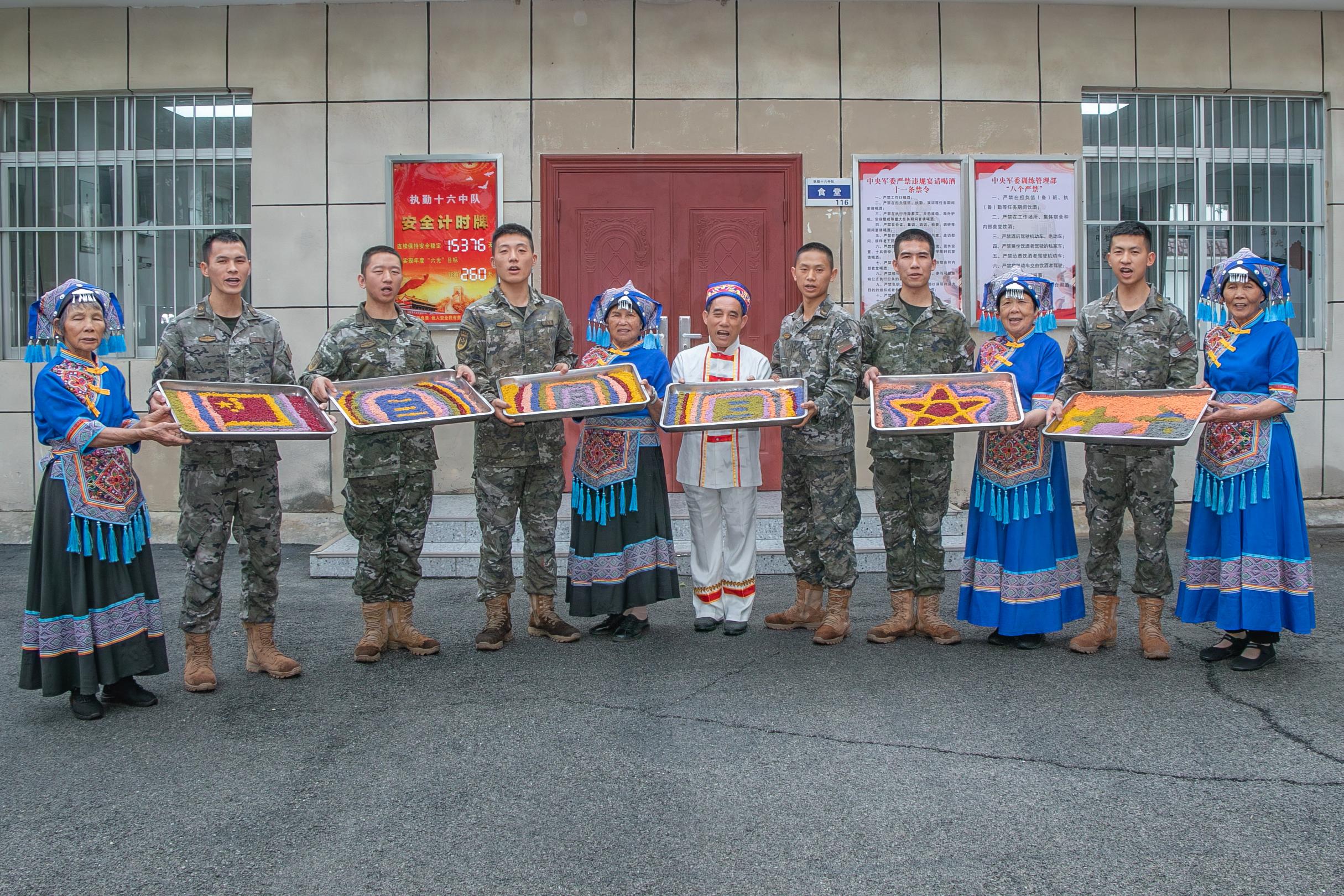 活动中,老人们与武警官兵一同换上壮乡民族服饰,沉浸式感受民俗文化。在食堂,天然植物染色的八色糯米整齐摆放,老人们手把手指导官兵塑形摆盘,共同拼出“三月三”、五星红旗等图案,寓意家国同心;军民携手制作豆腐酿,欢声笑语间,壮乡美食的清香与军民情谊交融弥漫。