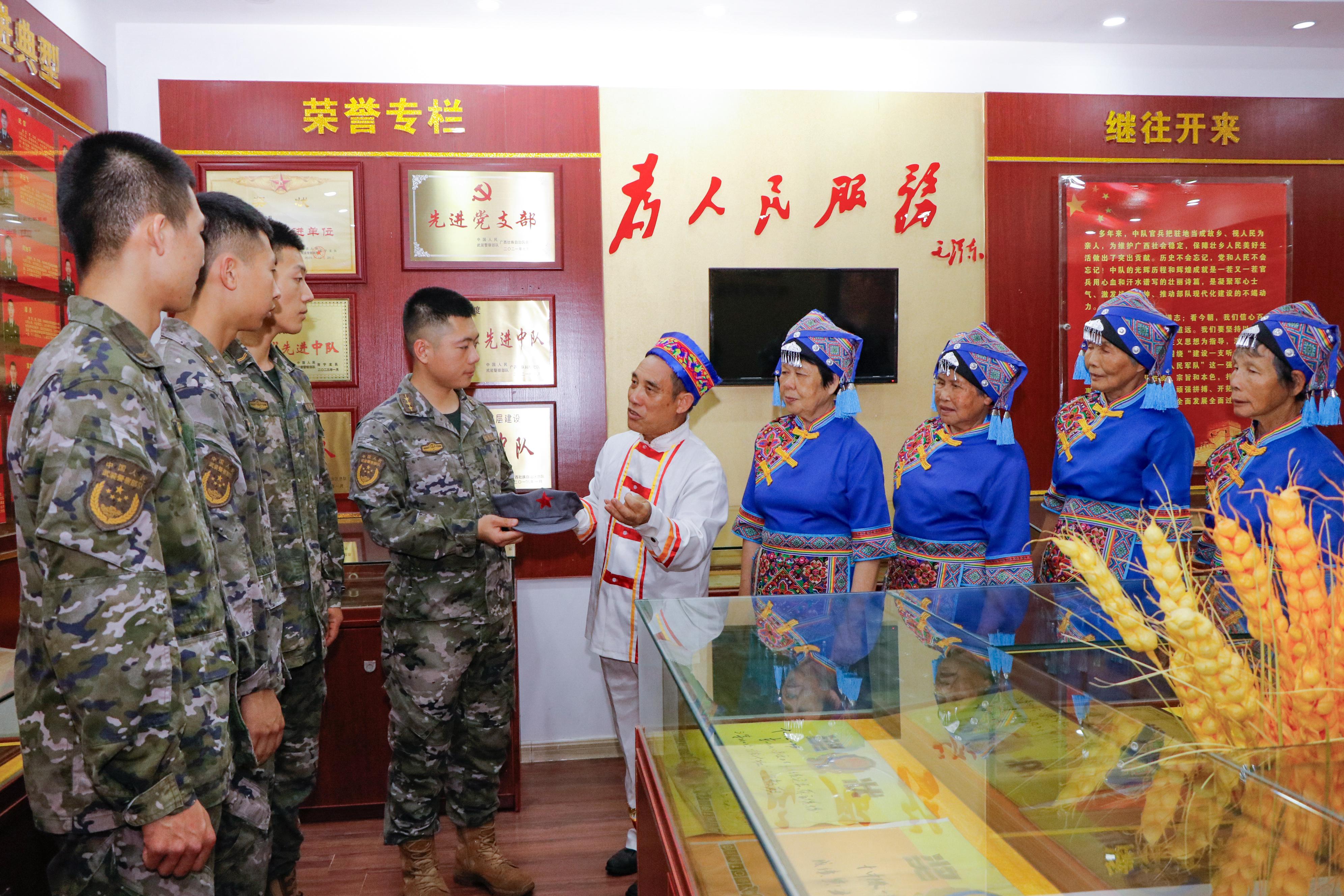 老人们还走进荣誉室,将一针一线手工缝制的老式红军帽郑重赠予官兵。细密针脚承载着红色传承,小小帽子寄托着壮乡人民对子弟兵的深情与敬意,让官兵在沉浸式感悟中赓续红色血脉、筑牢初心使命。