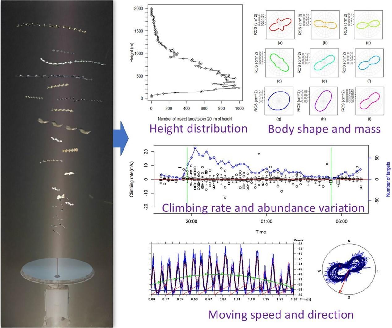 与此同时,借助我国自然界中昆虫种类多样性的特点,团队将雷达监测到的不同质量昆虫的最大探测高度与理论预测值相比较,并将探照灯诱虫器捕获昆虫的质量分布与雷达监测数据进行比对,校准了雷达对各类昆虫质量测定的精度。