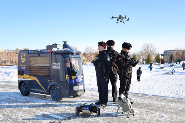 哈巴河县公安局启用智能巡逻机器人,构建“无人机+机器人+警力”立体巡防模式,在商圈、校园、车站等重点区域实现24小时不间断值守,既延伸防控触角、开展安全宣传,又能承担高危场景勘查任务,最大限度降低民警执勤风险。